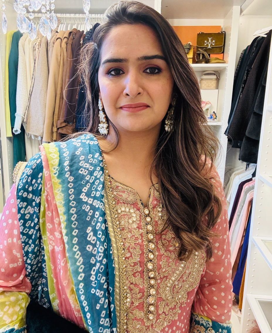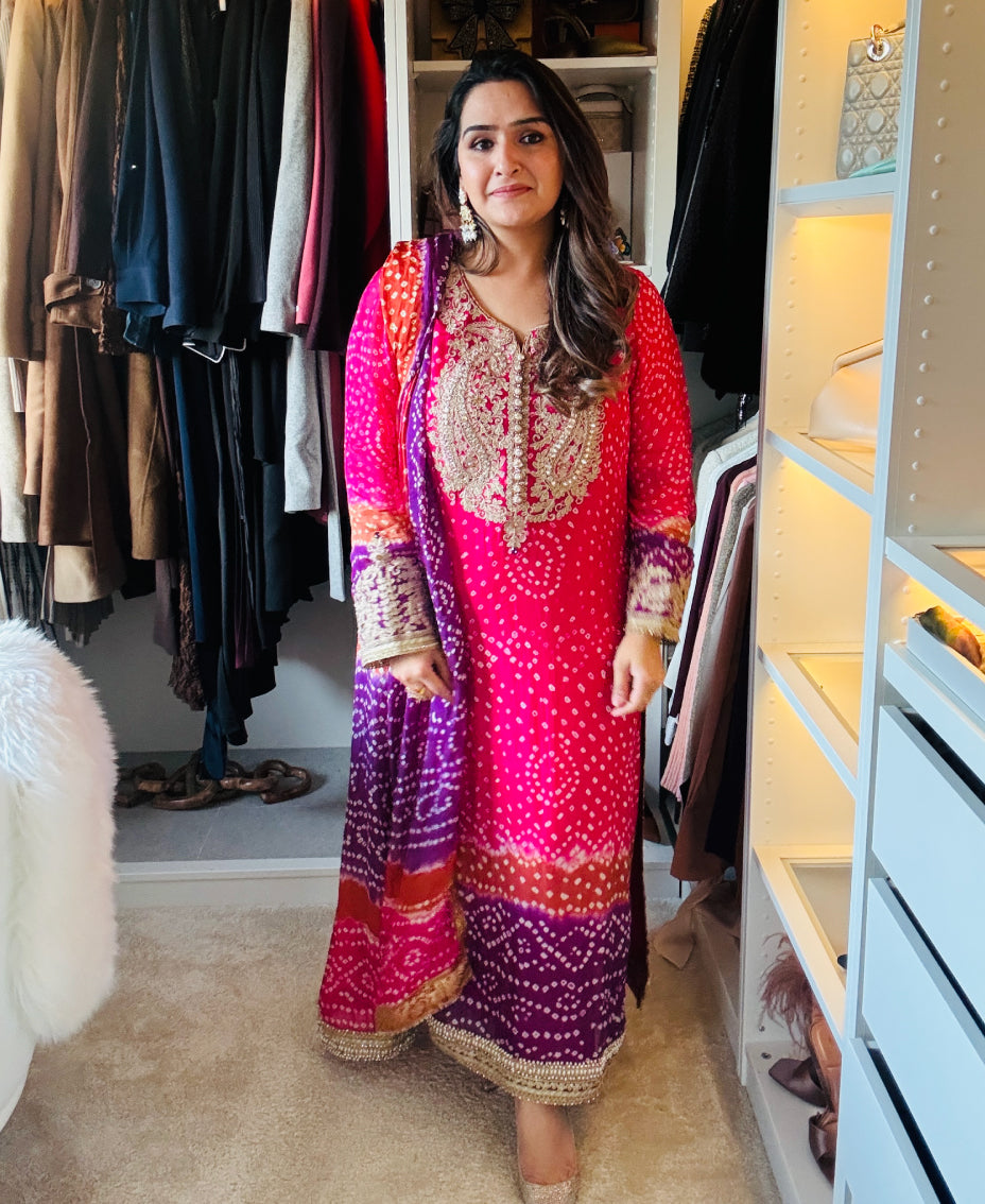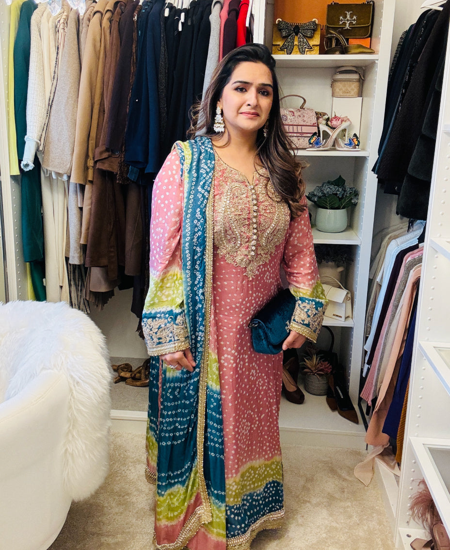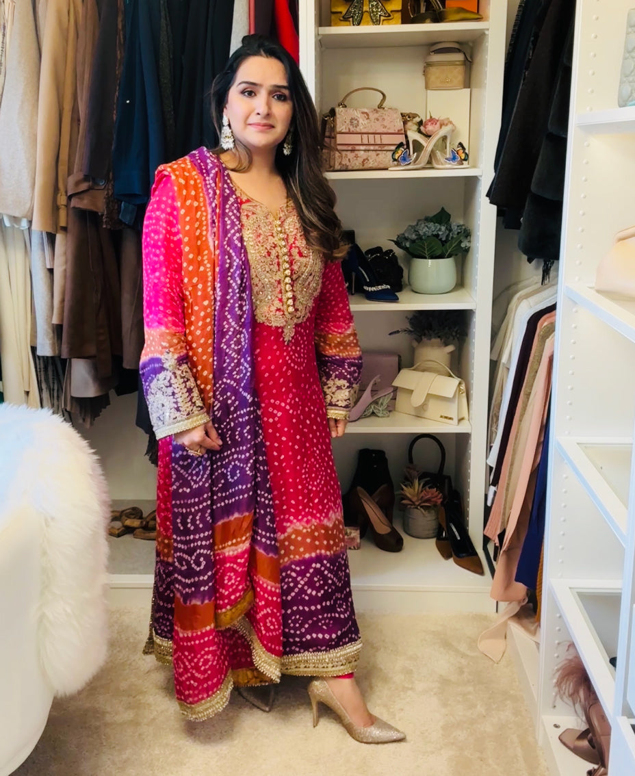 This is a traditional chunri / bandhni outfit. It comes in 3 beautiful colours Tea Pink, Blue and Hot Pink.