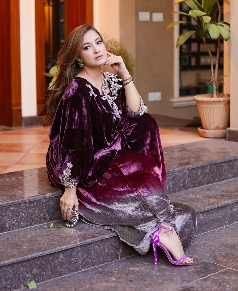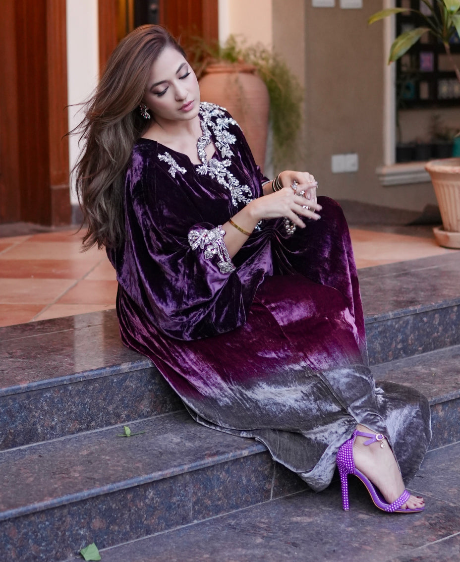 Crafted from ombré velvet that fades from deep plum to silvery grey, this ensemble captures the quiet drama of twilight. Intricately hand-embellished detailing adds a celestial shimmer, making it perfect for evenings that call for timeless sophistication and effortless allure.