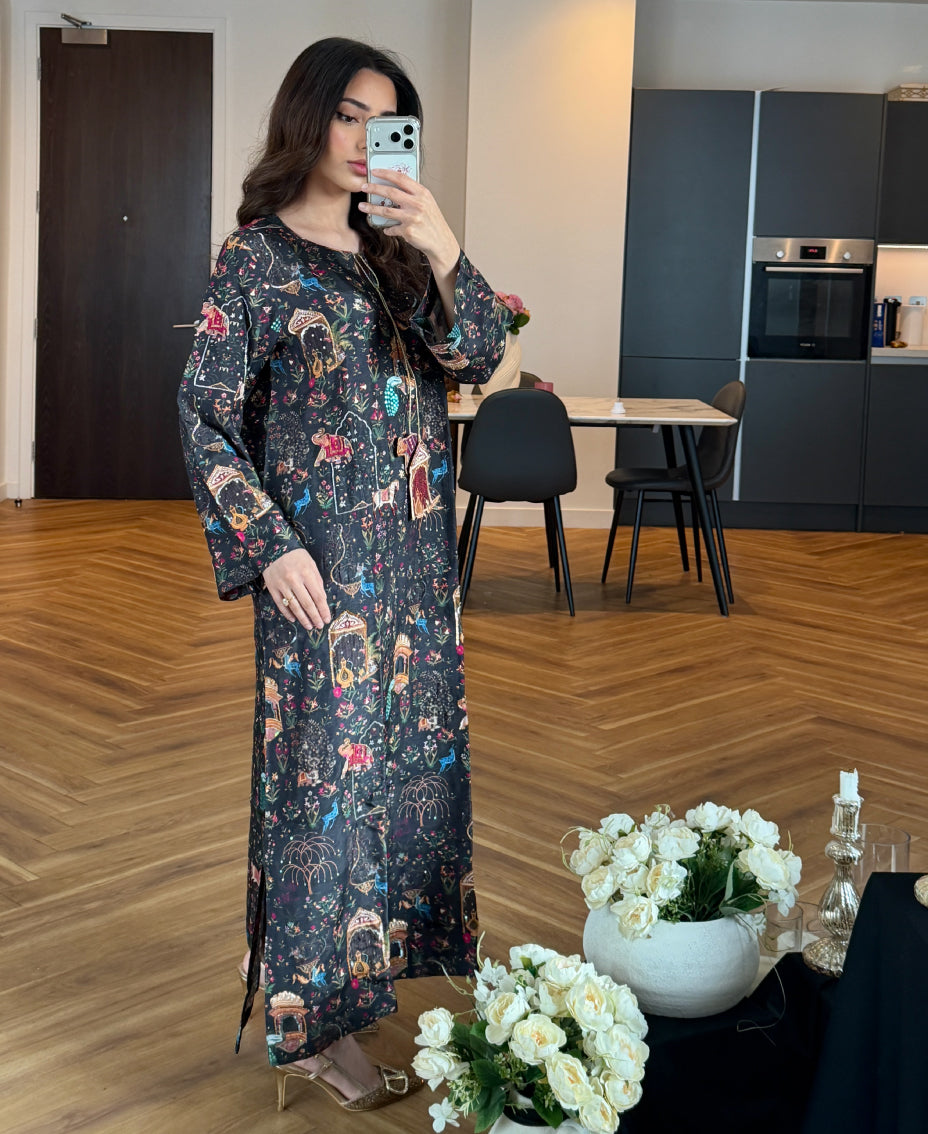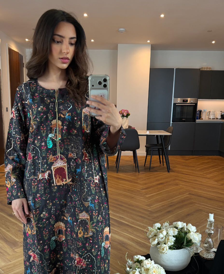 This Mughal kaftan crafted in luxurious Korea raw silk, adorned with delicate miniature-inspired embroidery. The design features graceful Mughal architecture, arches, and nature motifs, evoking the charm of royal courts and timeless heritage. Finished with a refined neckline and flowing silhouette, this kaftan blends historical artistry with contemporary elegance—perfect for festive evenings, cultural gatherings, and statement occasions.