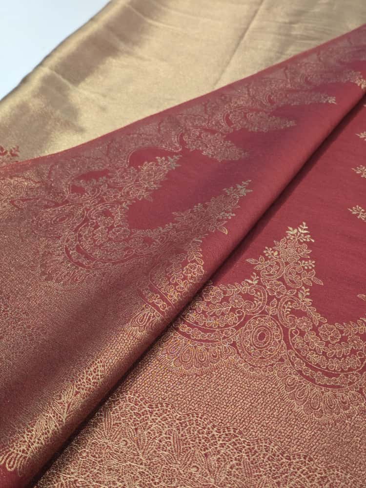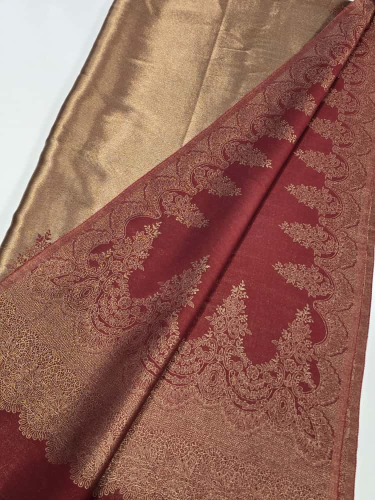 Wrap yourself in timeless sophistication with the Amber Royal Kani Shawl, a masterpiece of traditional craftsmanship and modern allure. This luxurious shawl features a rich bronze-gold base with intricate woven patterns in deep maroon, reminiscent of Kashmiri artistry. The delicate border showcases fine lace-like motifs that add an exquisite touch of grace and refinement. Crafted from premium silk-blend fabric, it drapes beautifully and exudes a subtle sheen, perfect for festive occasions or elegant evenings. A true statement of heritage and style.