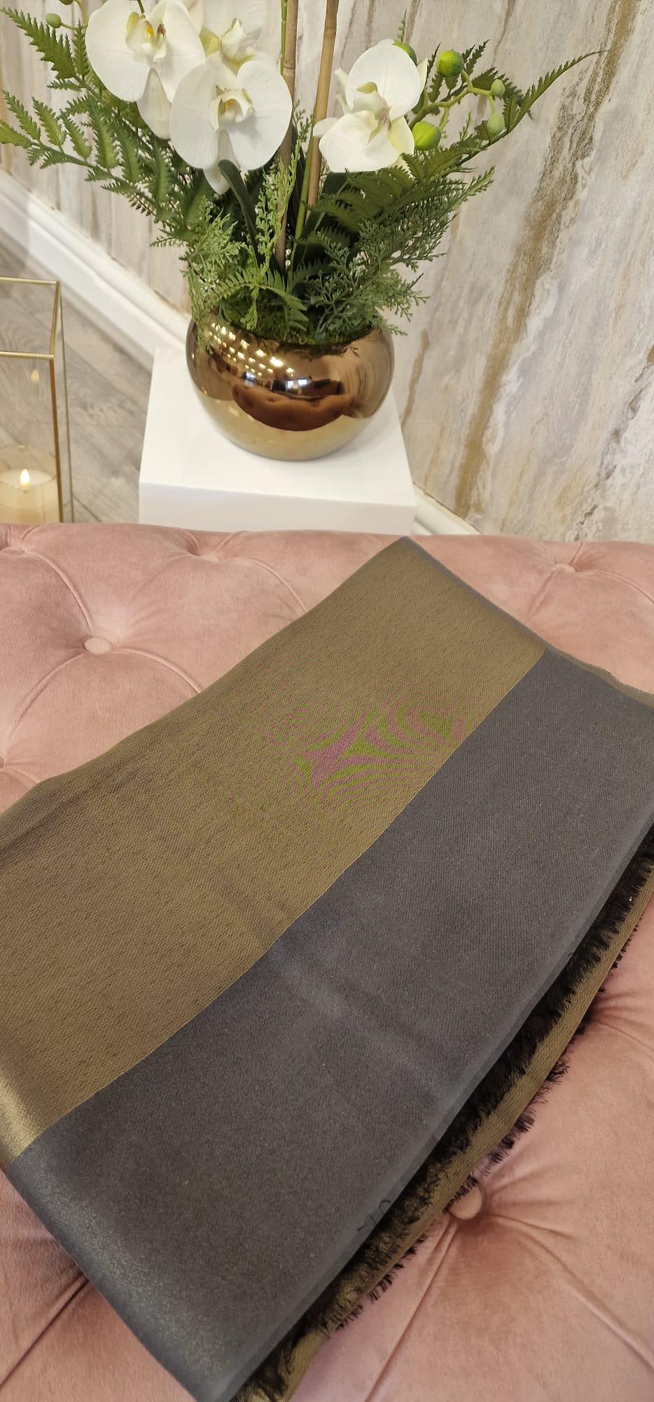 Elegant and timeless, this grey and gold plain shawl features a grey base beautifully accented with subtle gold tones. Its simple yet sophisticated design makes it a versatile accessory, perfect for adding a touch of effortless elegance to any outfit.