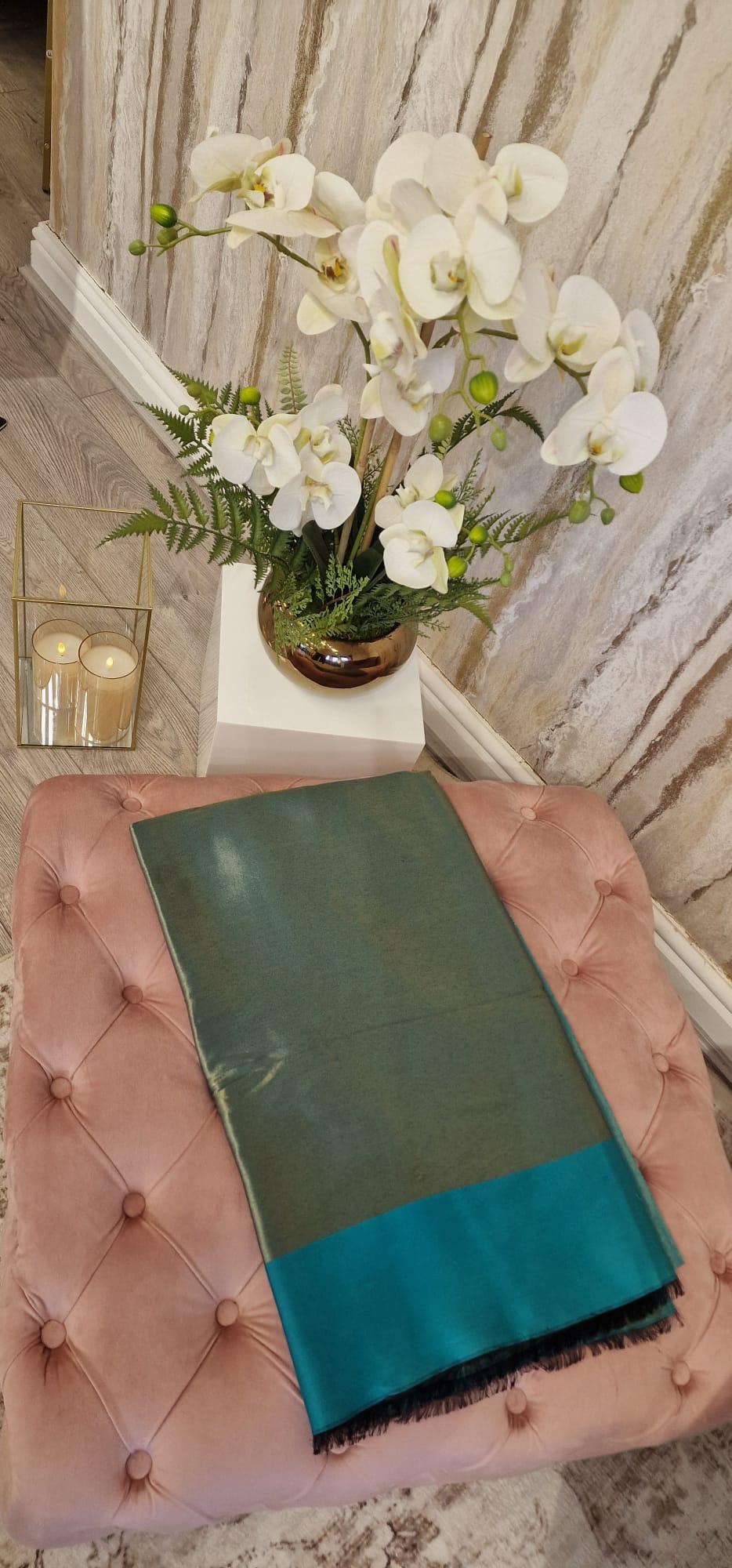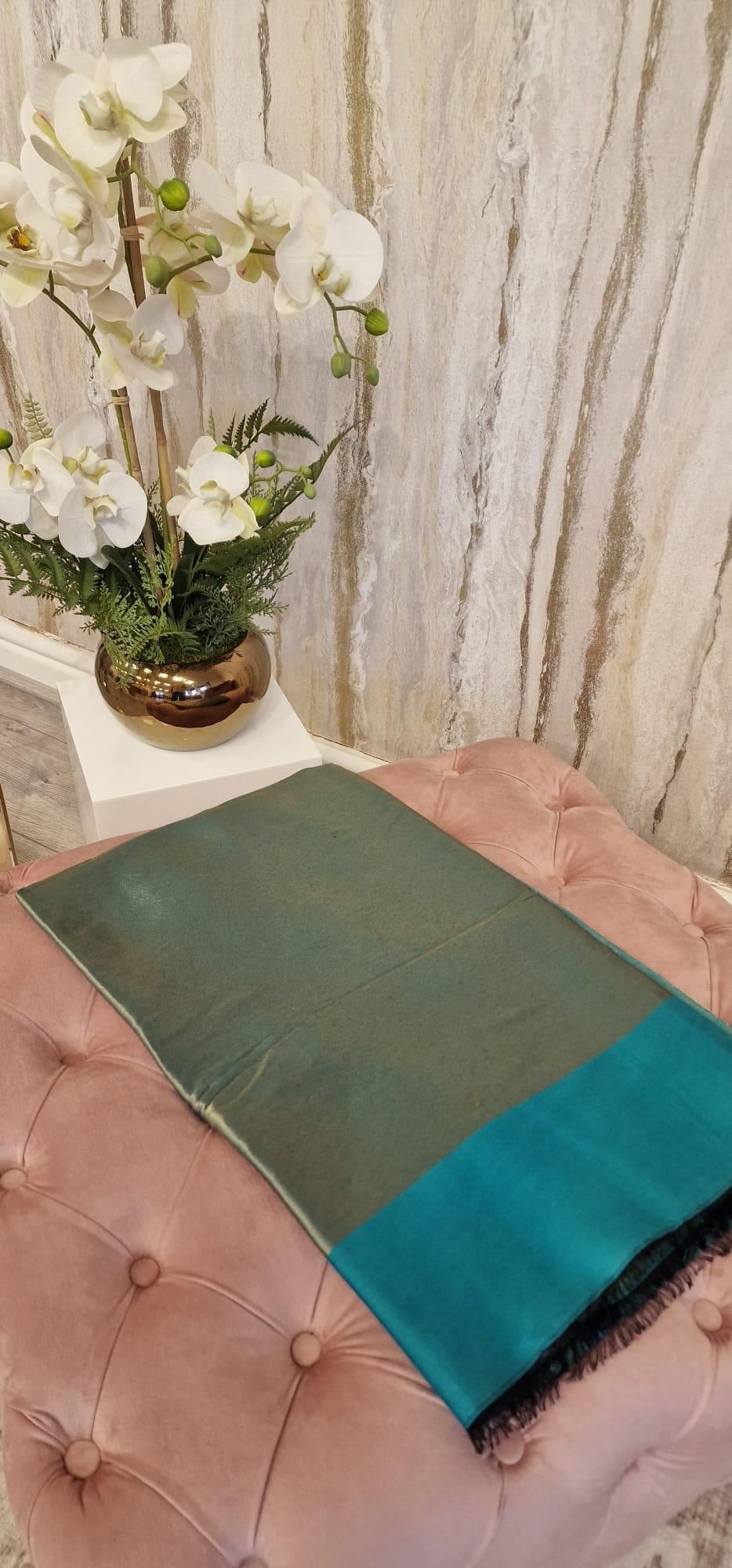 An elegant shawl crafted in rich teal tones with softly blended gold detailing, creating a beautifully fluid and luminous effect. The gold melts seamlessly into the teal fabric, giving it a subtle shimmer that catches the light with every movement. Refined yet effortlessly graceful.