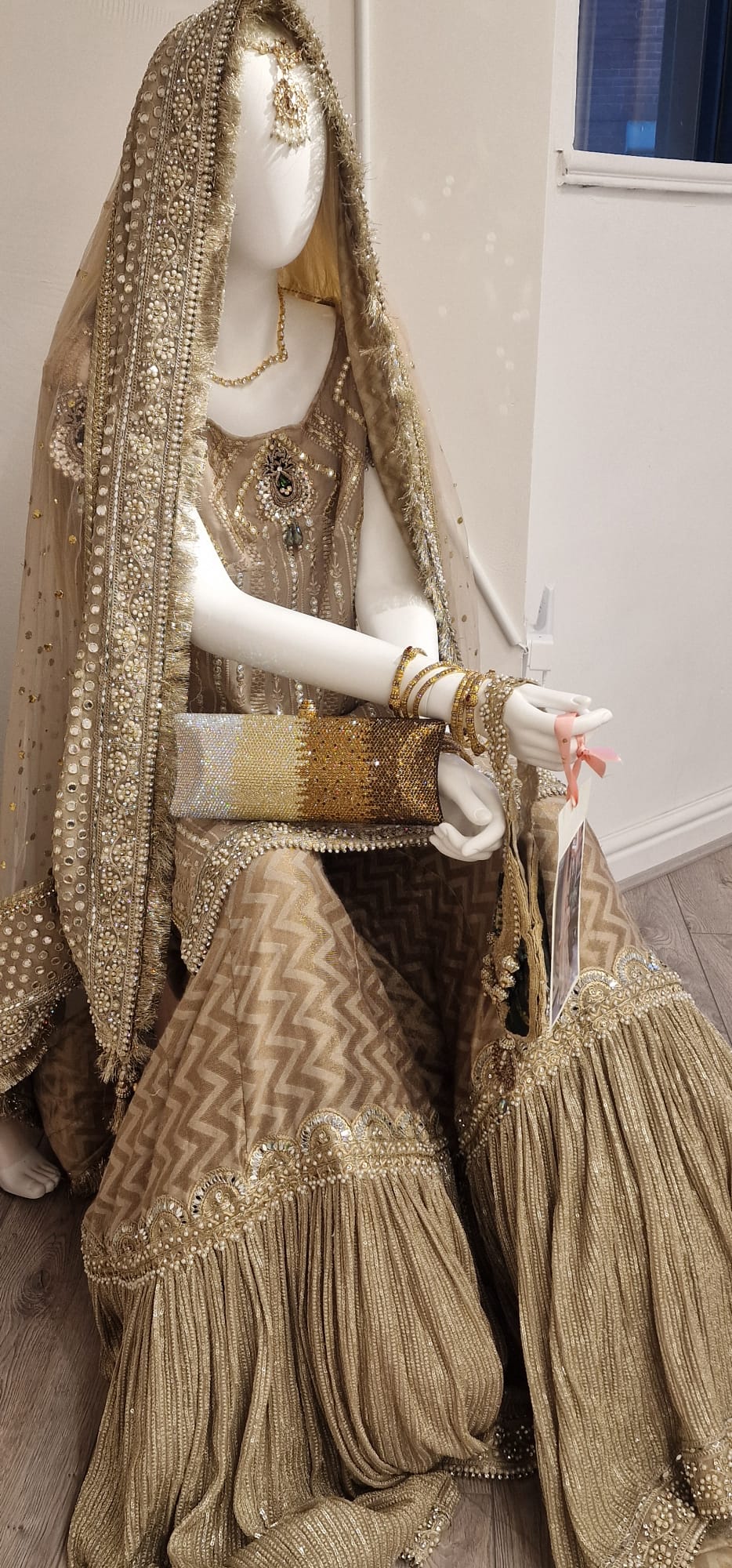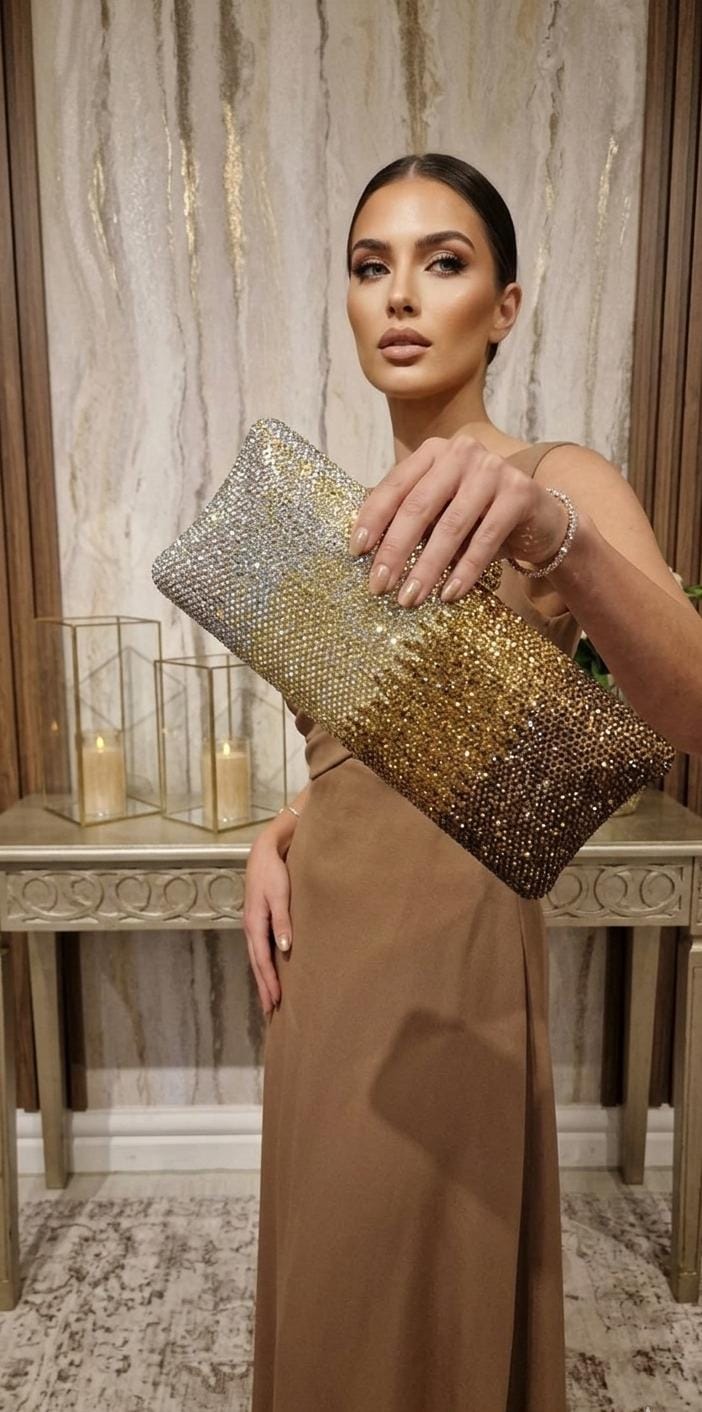 A luxurious gold clutch, fully encrusted with shimmering gems for a radiant, opulent look. Its warm, golden sparkle exudes sophistication and charm, making it the ideal companion for glamorous events and festive evenings. Elegant, eye-catching, and effortlessly chic.