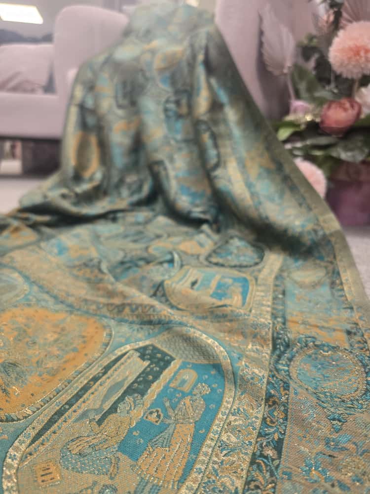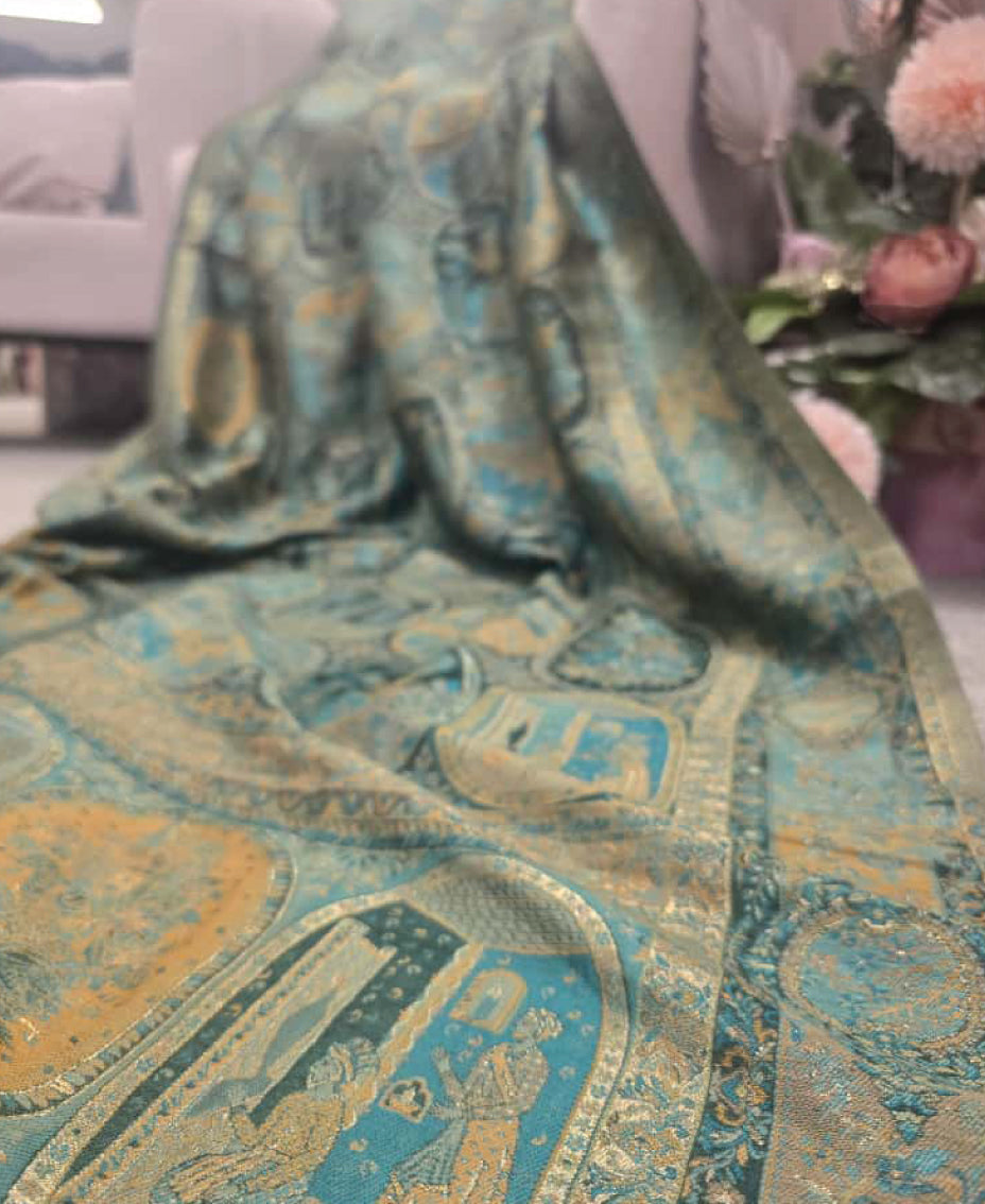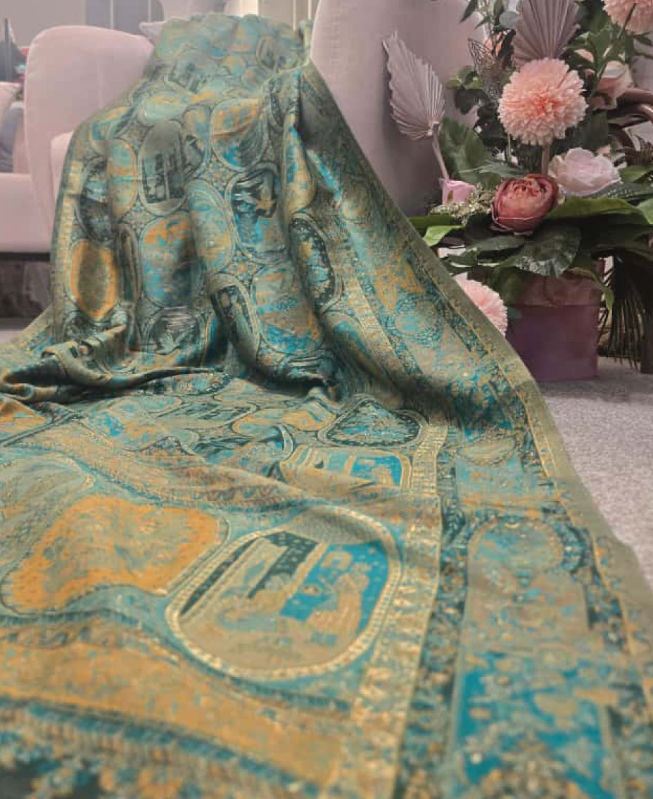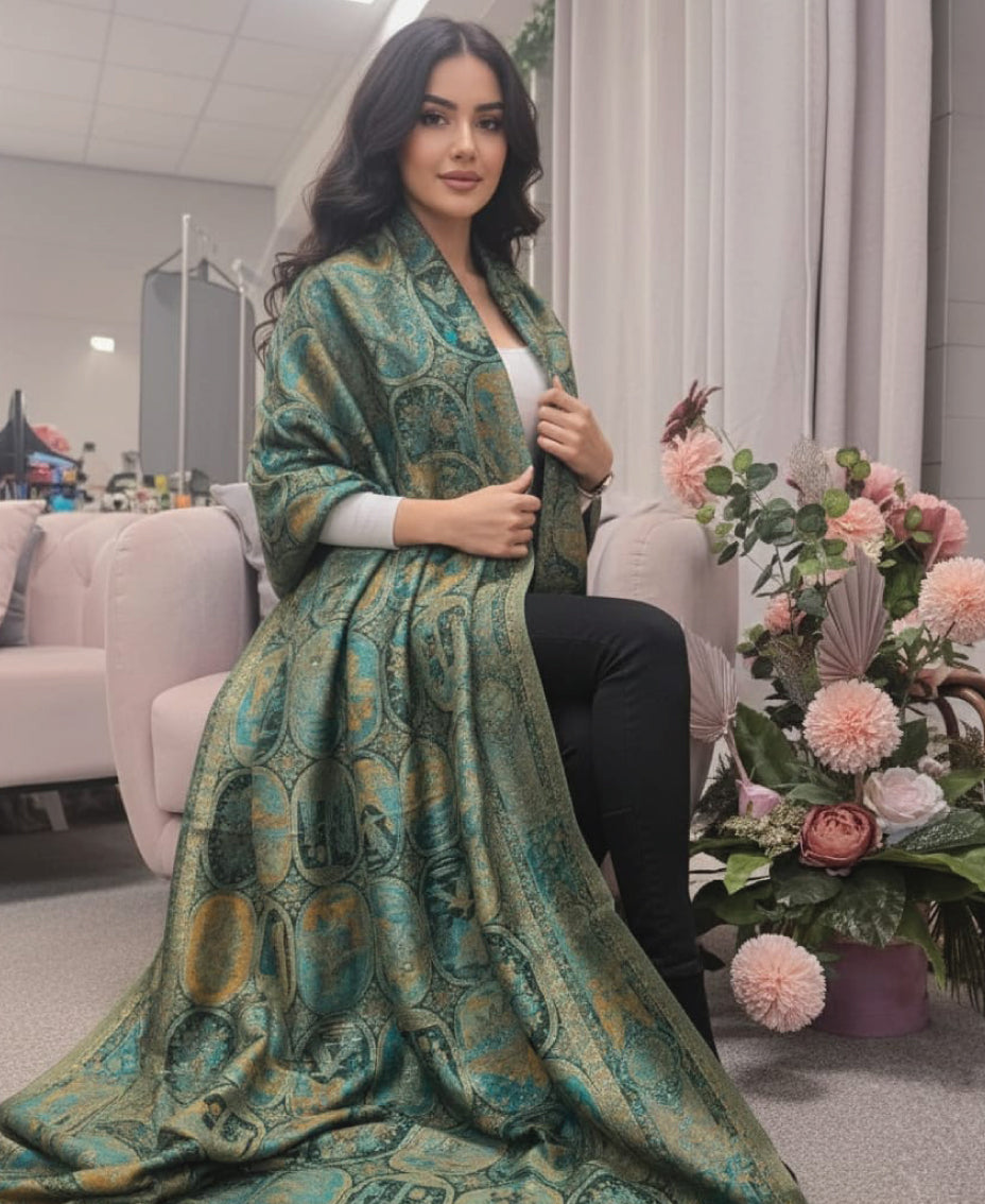 Discover our Mughal Kani Shawl, where a deep green field blooms with timeless botanical and Mughal motifs. Each thread is placed with precision using the ancient Kani loom, creating a reversible masterpiece of heirloom luxury. Drape yourself in history and unparalleled craftsmanship