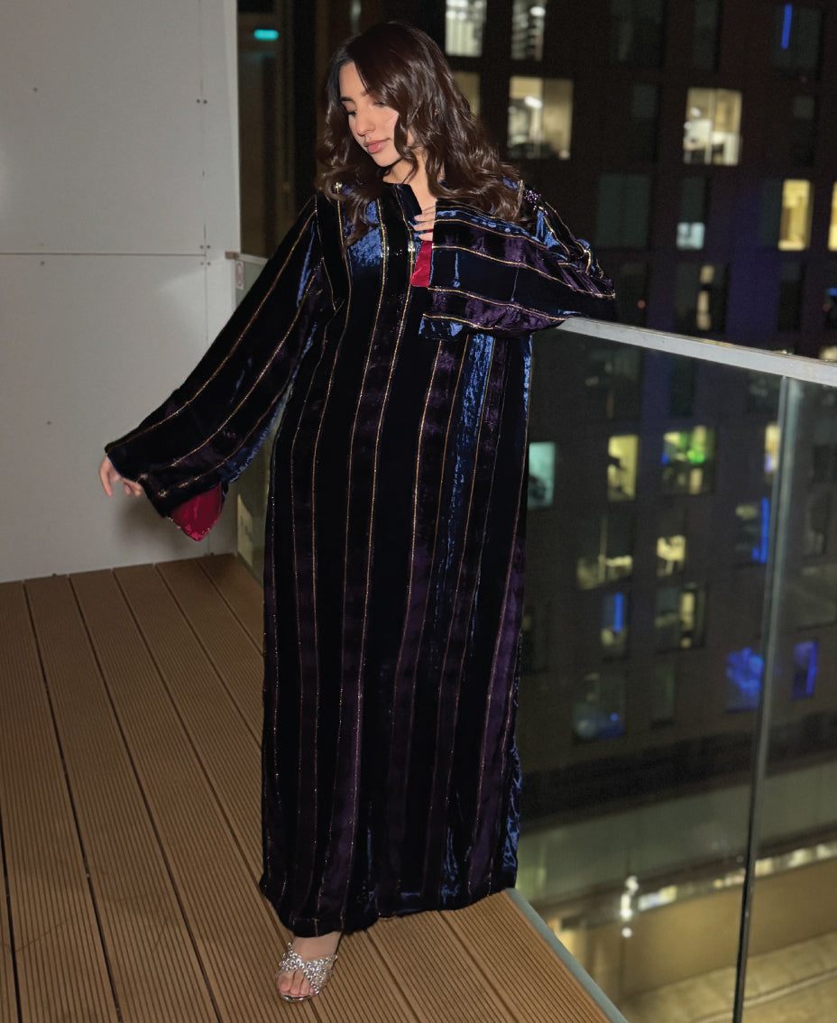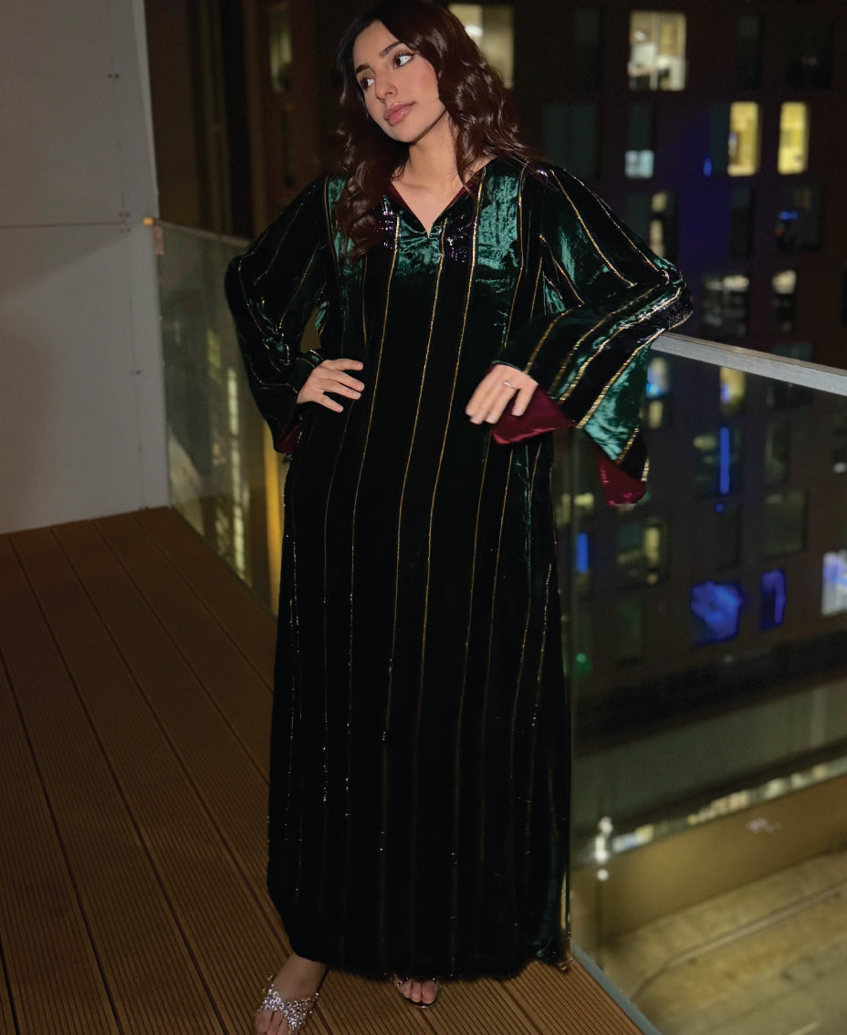 A stunning blend of deep emerald green velvet with golden pinstripes, this version feels rich and enchanting. The burgundy sleeve lining brings a warm, luxurious accent that elevates the entire kaftan. The colour catches the light beautifully, shifting between jewel-tone richness and dark elegance. Perfect for winter evenings, celebrations, and glamorous occasions.
