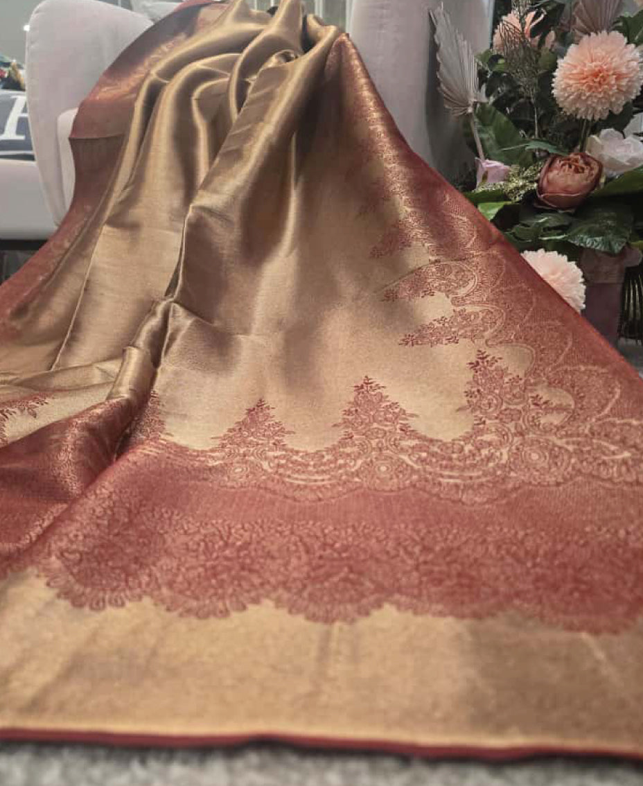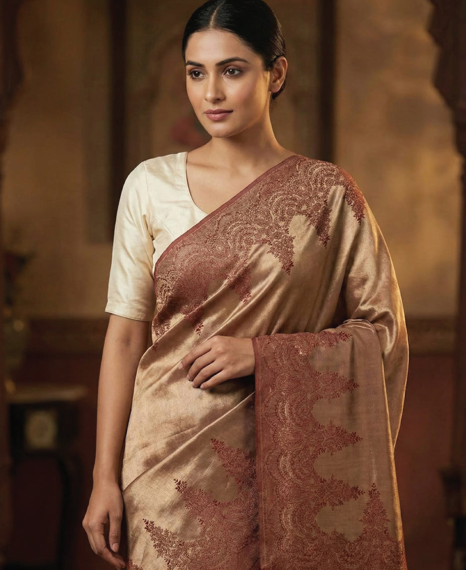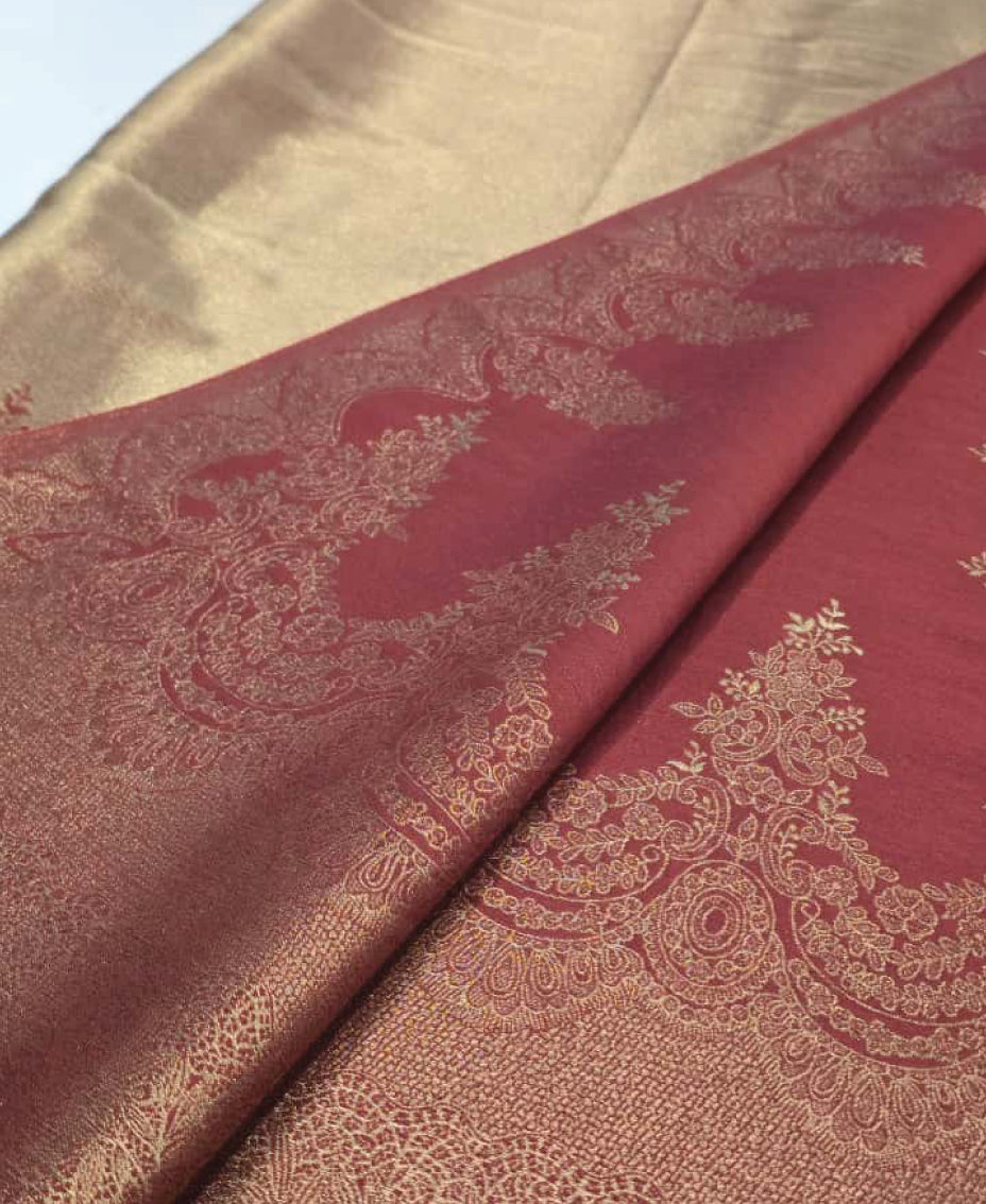 Wrap yourself in timeless sophistication with the Amber Royal Kani Shawl, a masterpiece of traditional craftsmanship and modern allure. This luxurious shawl features a rich bronze-gold base with intricate woven patterns in deep maroon, reminiscent of Kashmiri artistry. The delicate border showcases fine lace-like motifs that add an exquisite touch of grace and refinement. Crafted from premium silk-blend fabric, it drapes beautifully and exudes a subtle sheen, perfect for festive occasions or elegant evenings. A true statement of heritage and style.