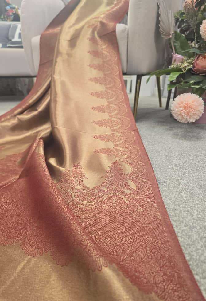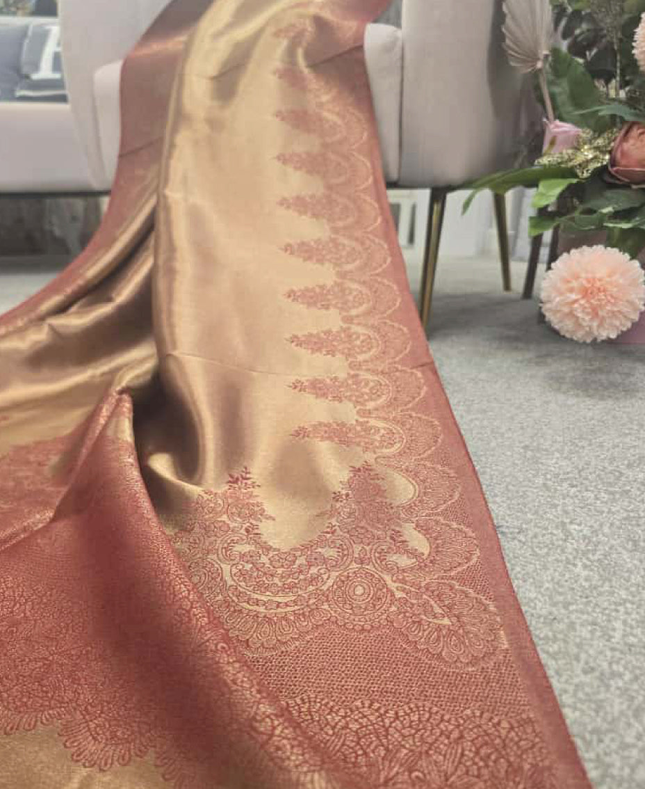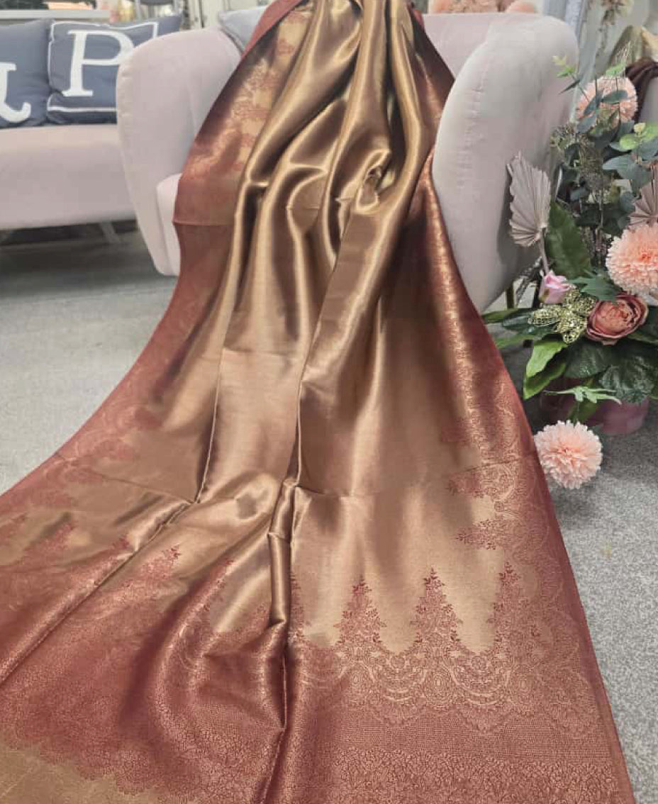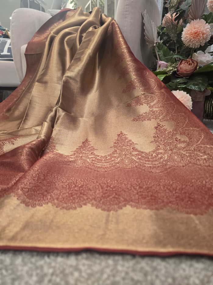 Wrap yourself in timeless sophistication with the Amber Royal Kani Shawl, a masterpiece of traditional craftsmanship and modern allure. This luxurious shawl features a rich bronze-gold base with intricate woven patterns in deep maroon, reminiscent of Kashmiri artistry. The delicate border showcases fine lace-like motifs that add an exquisite touch of grace and refinement. Crafted from premium silk-blend fabric, it drapes beautifully and exudes a subtle sheen, perfect for festive occasions or elegant evenings. A true statement of heritage and style.