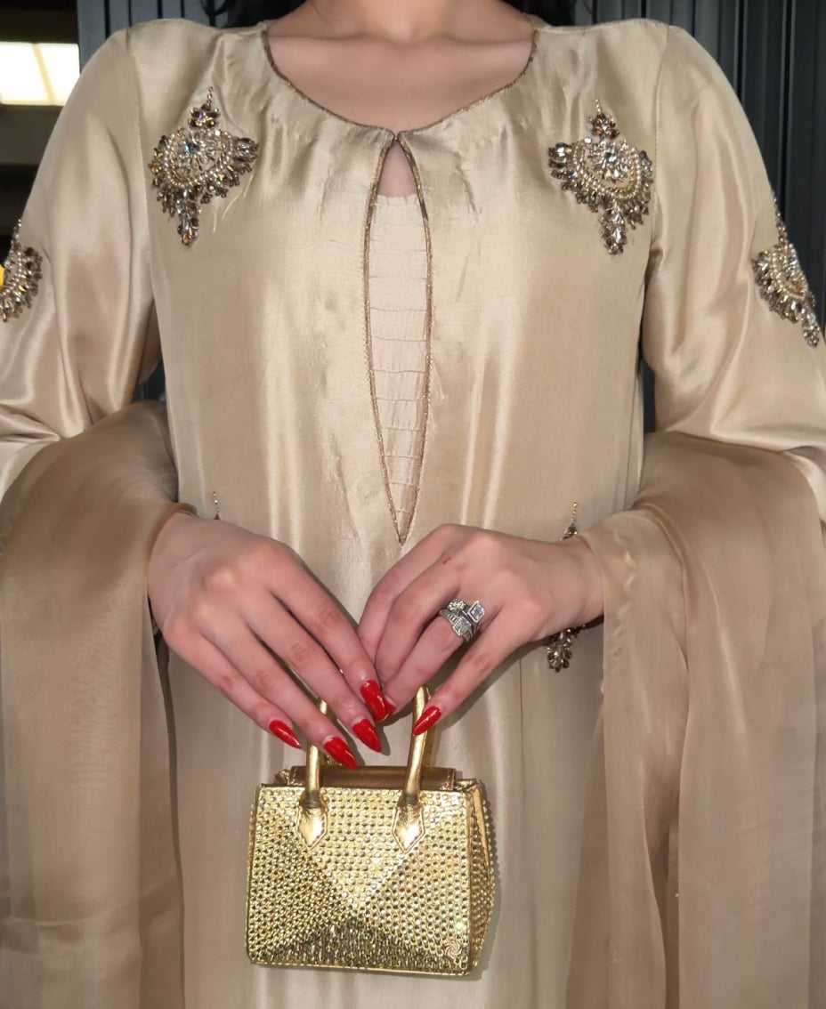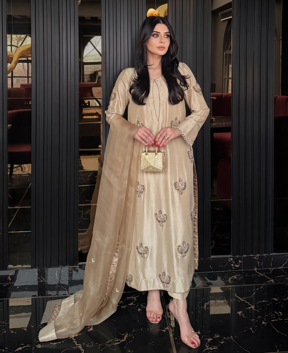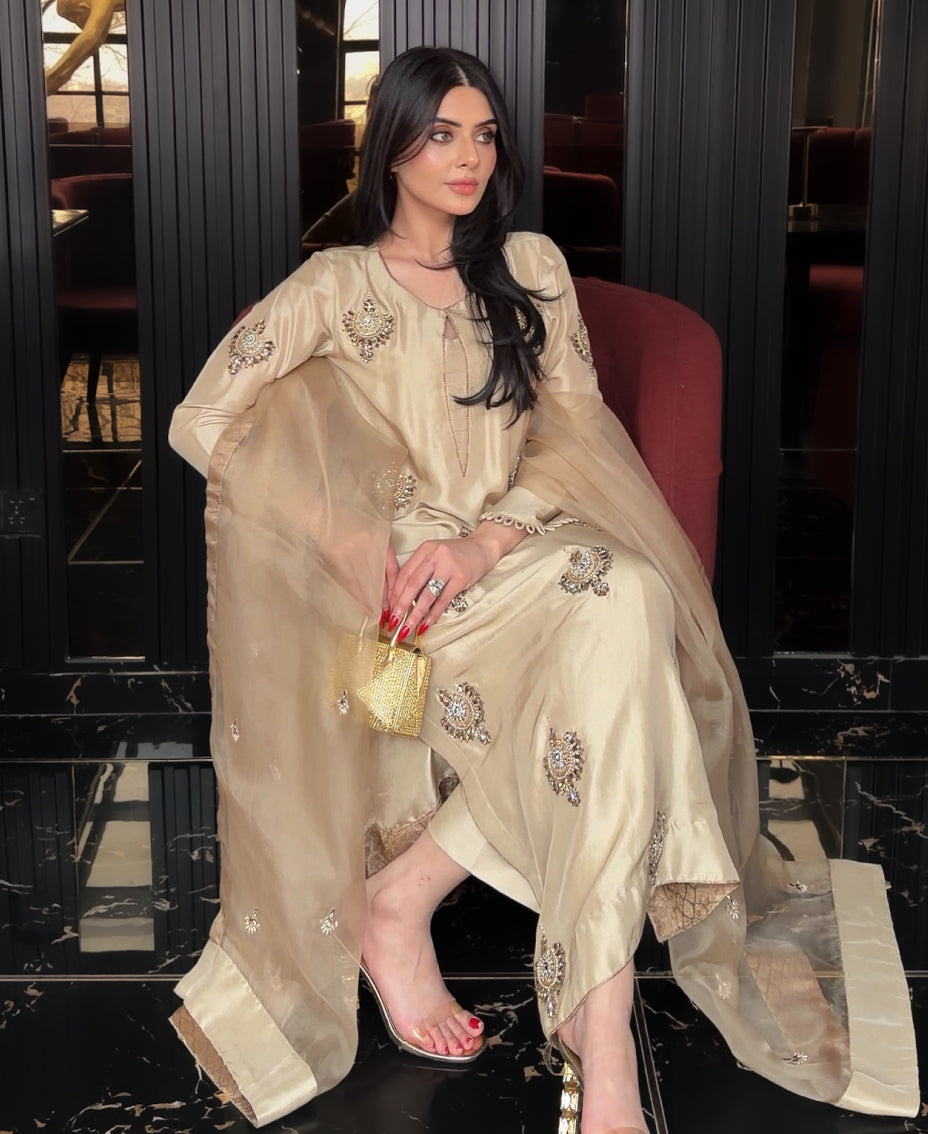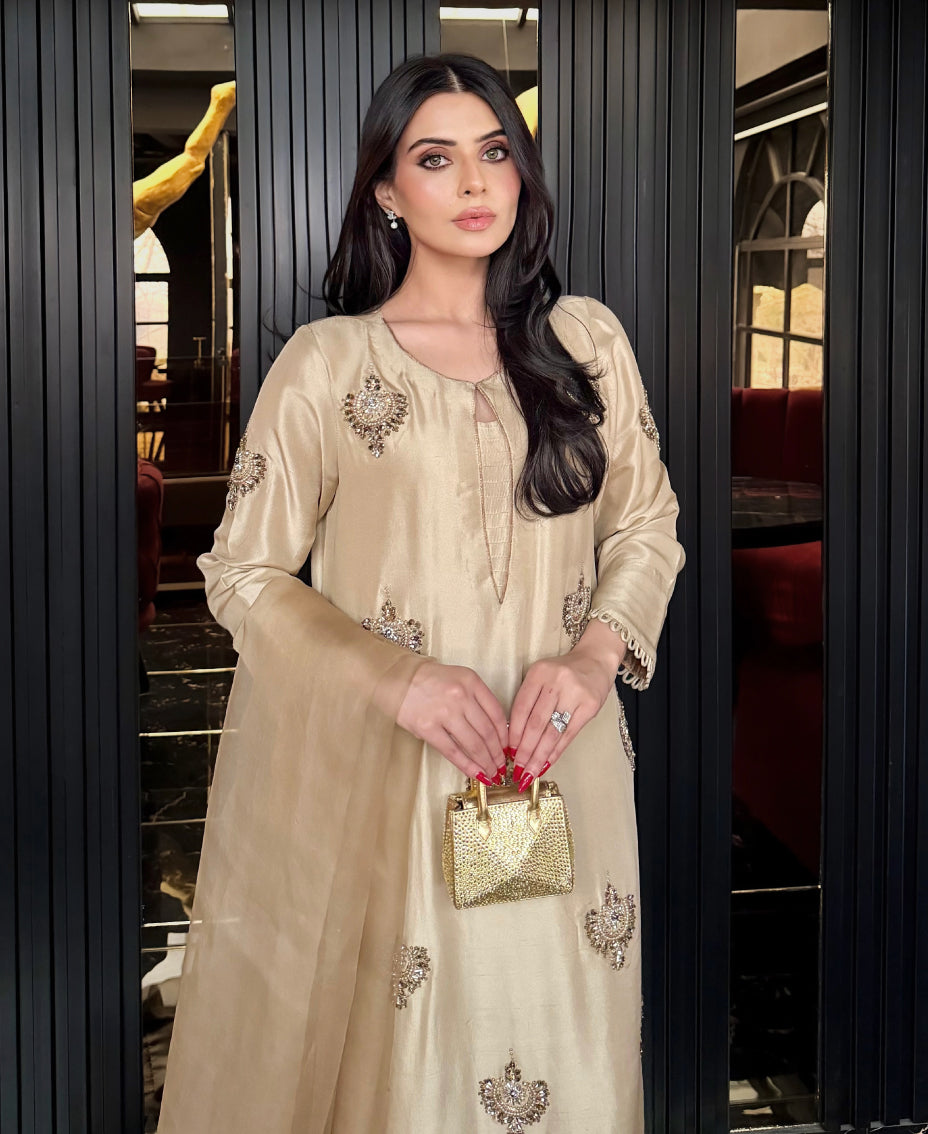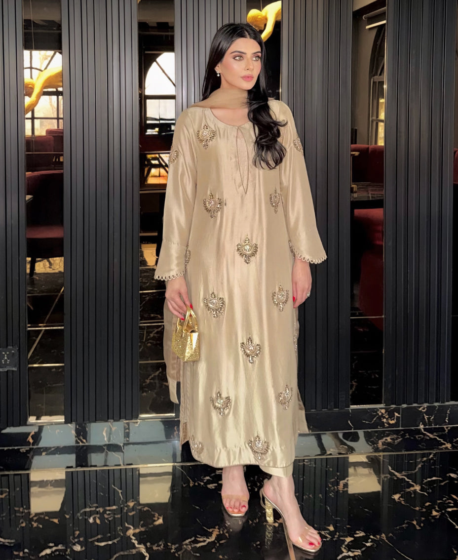 Crafted in pure Rawsilk fabric and adorned with delicate hand embellishment, this champagne-toned ensemble radiates effortless elegance and timeless grace. Perfect for refined festive moments.