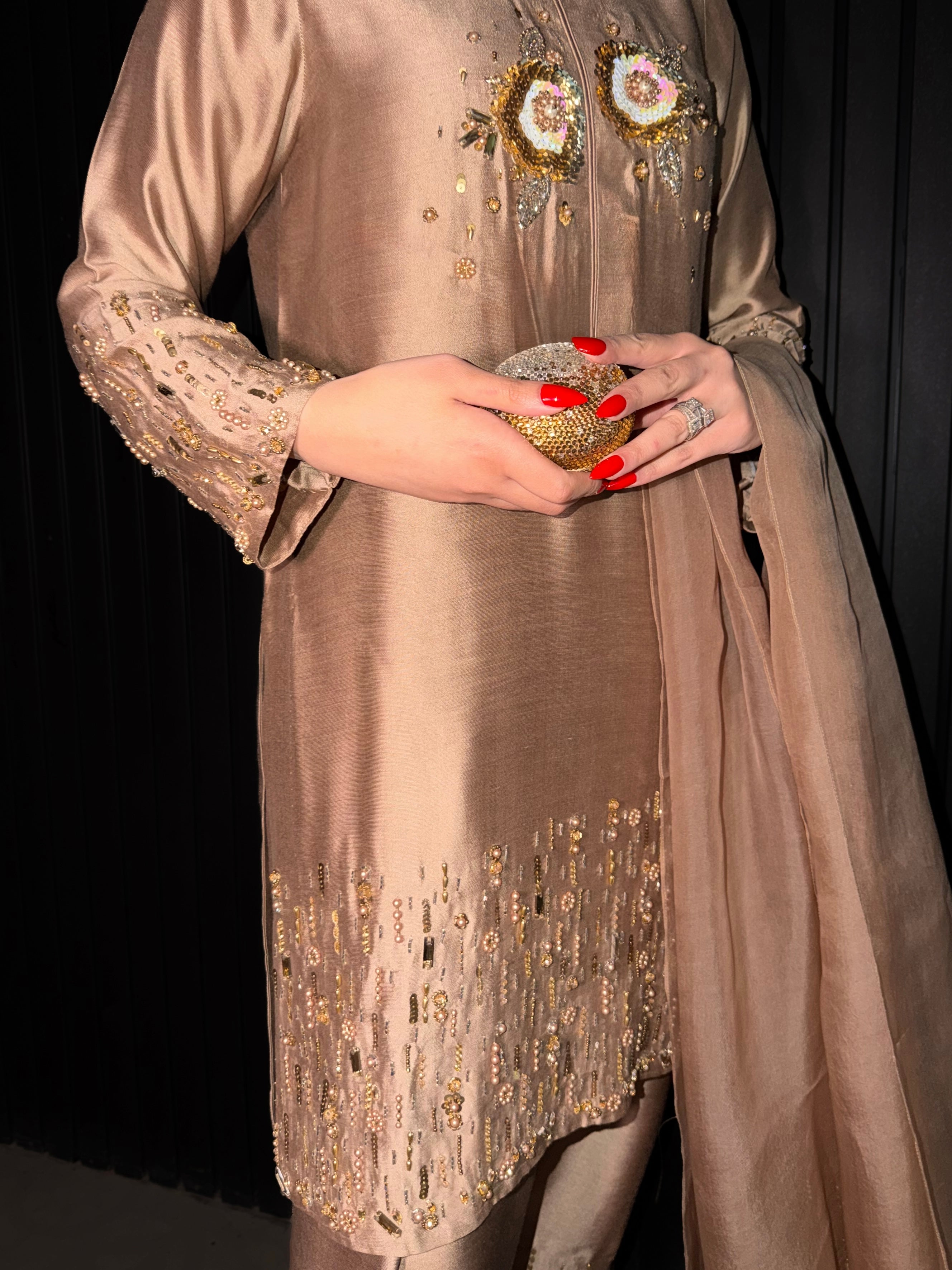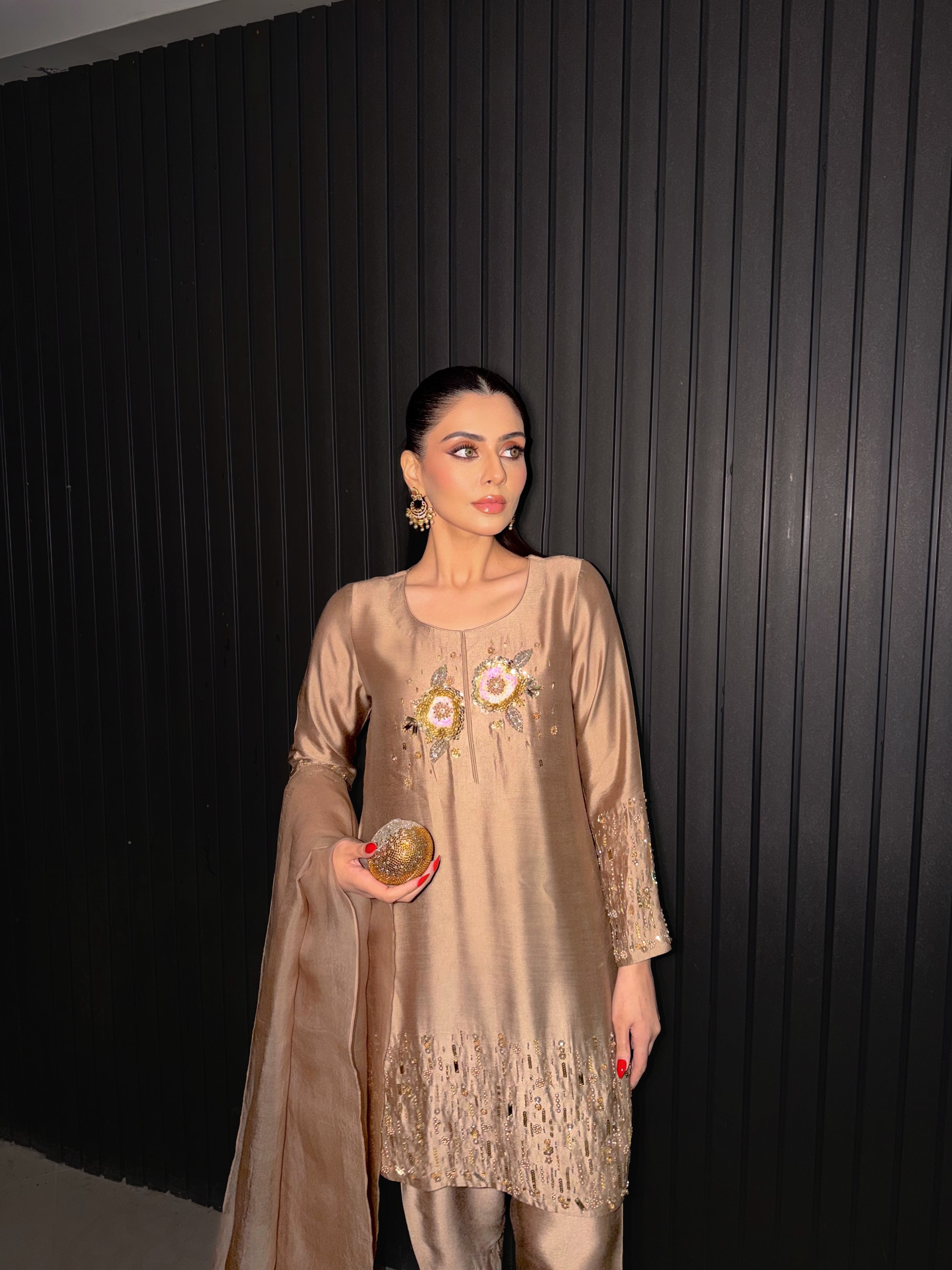 Paired with a matching Shisha silk shalwar, the ensemble is elevated with coordinated sequin detailing at the hem, adding movement and visual interest. The look is completed with a sheer, lightweight dupatta finished with subtle embellishments, enhancing the outfit’s ethereal charm and festive appeal.