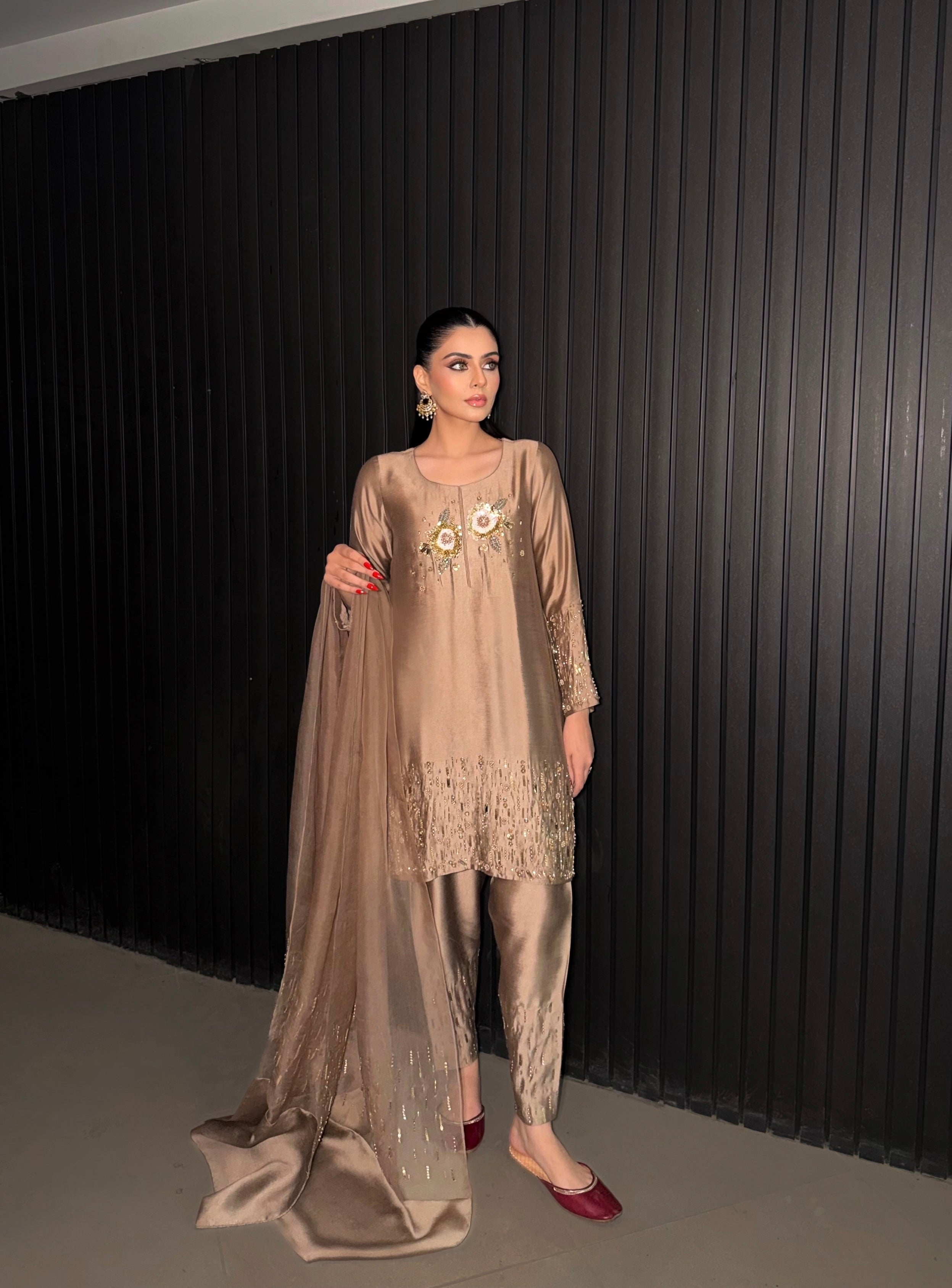 Step into timeless elegance with this exquisitely crafted Shisha silk shalwar kameez, designed to celebrate tradition with refined sophistication. The kameez is tailored in luxurious Shisha silk, featuring delicate sequin embellishments and intricate handwork that add a soft, festive shimmer while maintaining a graceful, understated look.