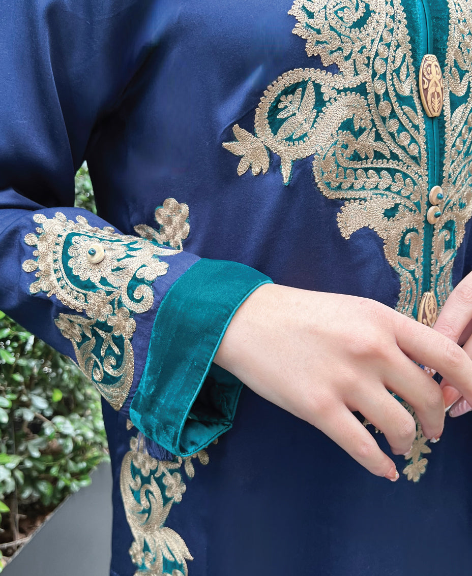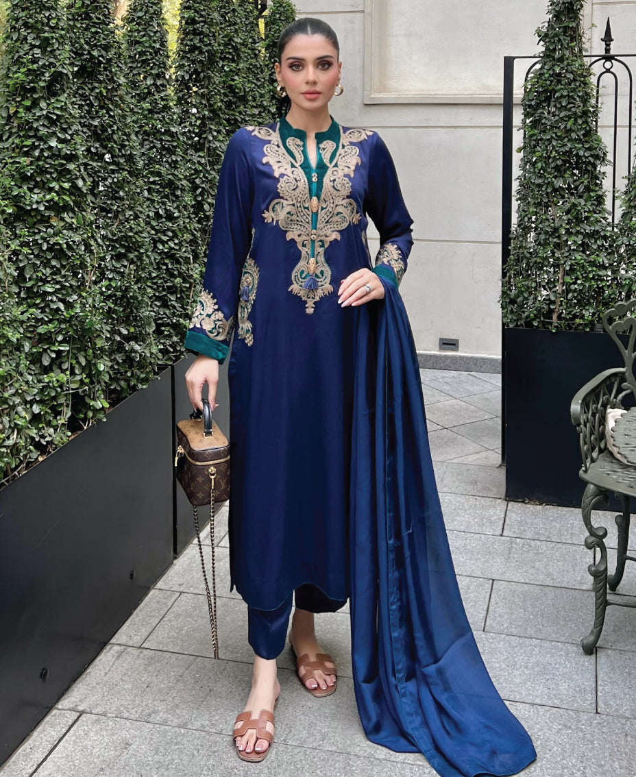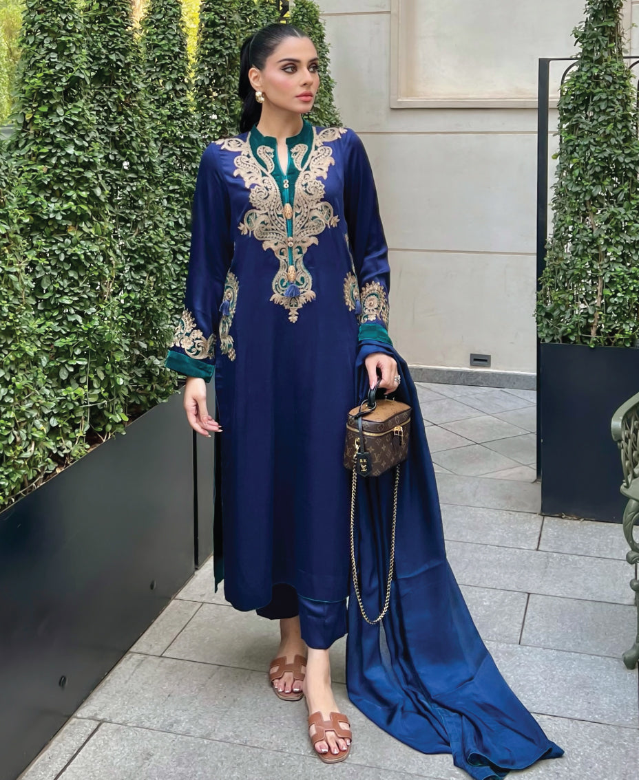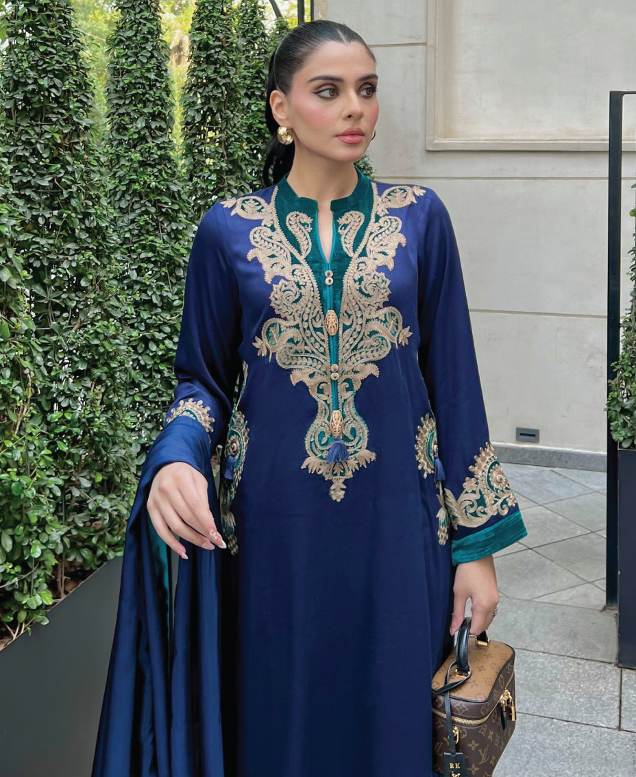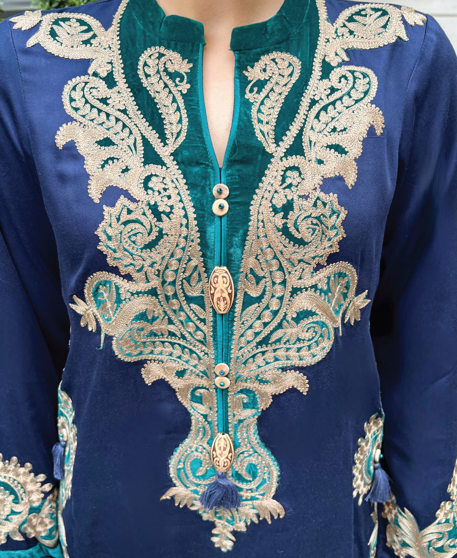 Elevate your wardrobe with Marine Luxe, a timeless navy-blue outfit crafted for women who appreciate effortless elegance. Designed in a rich, flowing fabric, this ensemble features exquisite gold and teal embroidery along the neckline, sleeves, and front—delivering a statement look without compromising on comfort.