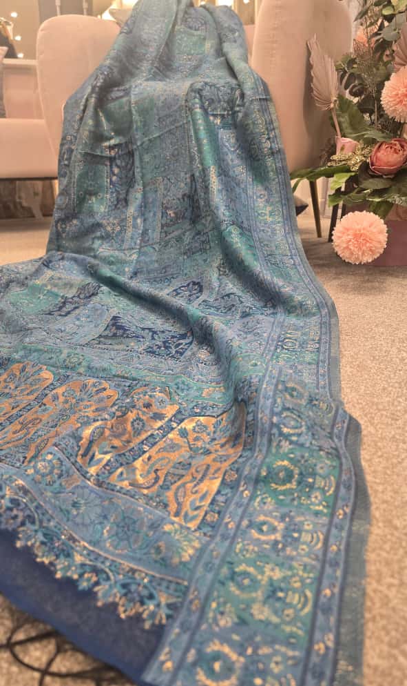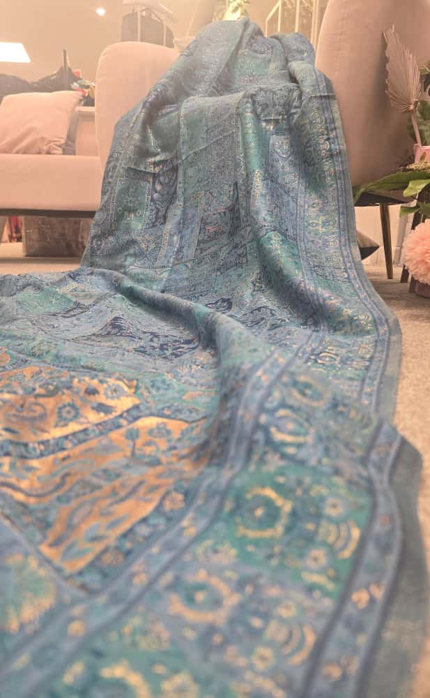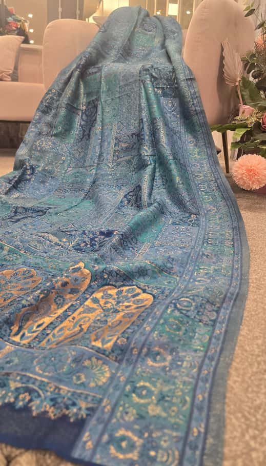 Discover our Mughal Kani Shawl, where a deep blue field blooms with timeless botanical motifs. Each thread is placed with precision using the ancient Kani loom, creating a reversible masterpiece of heirloom luxury. Drape yourself in history and unparalleled craftsmanship