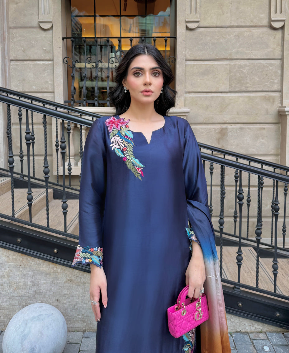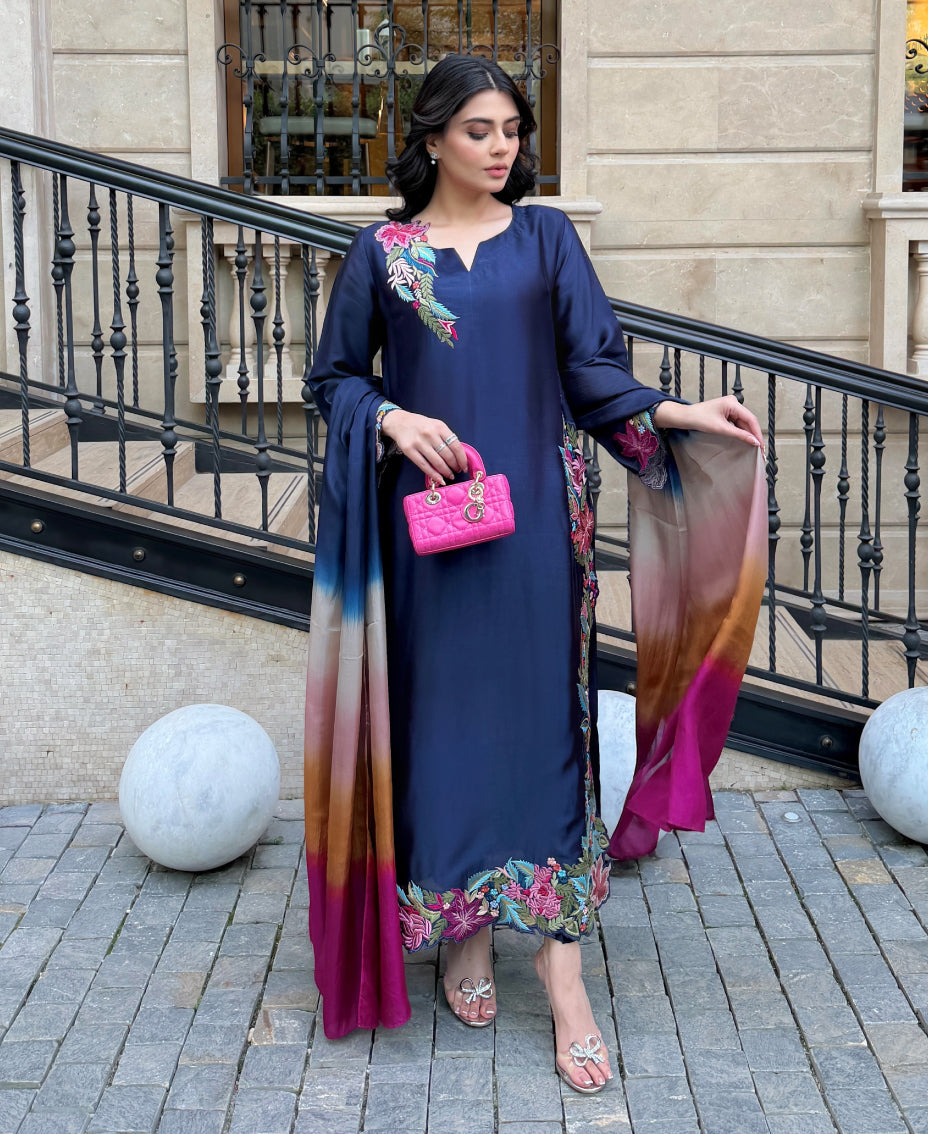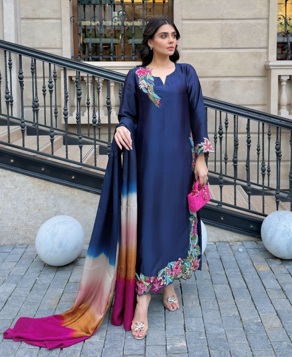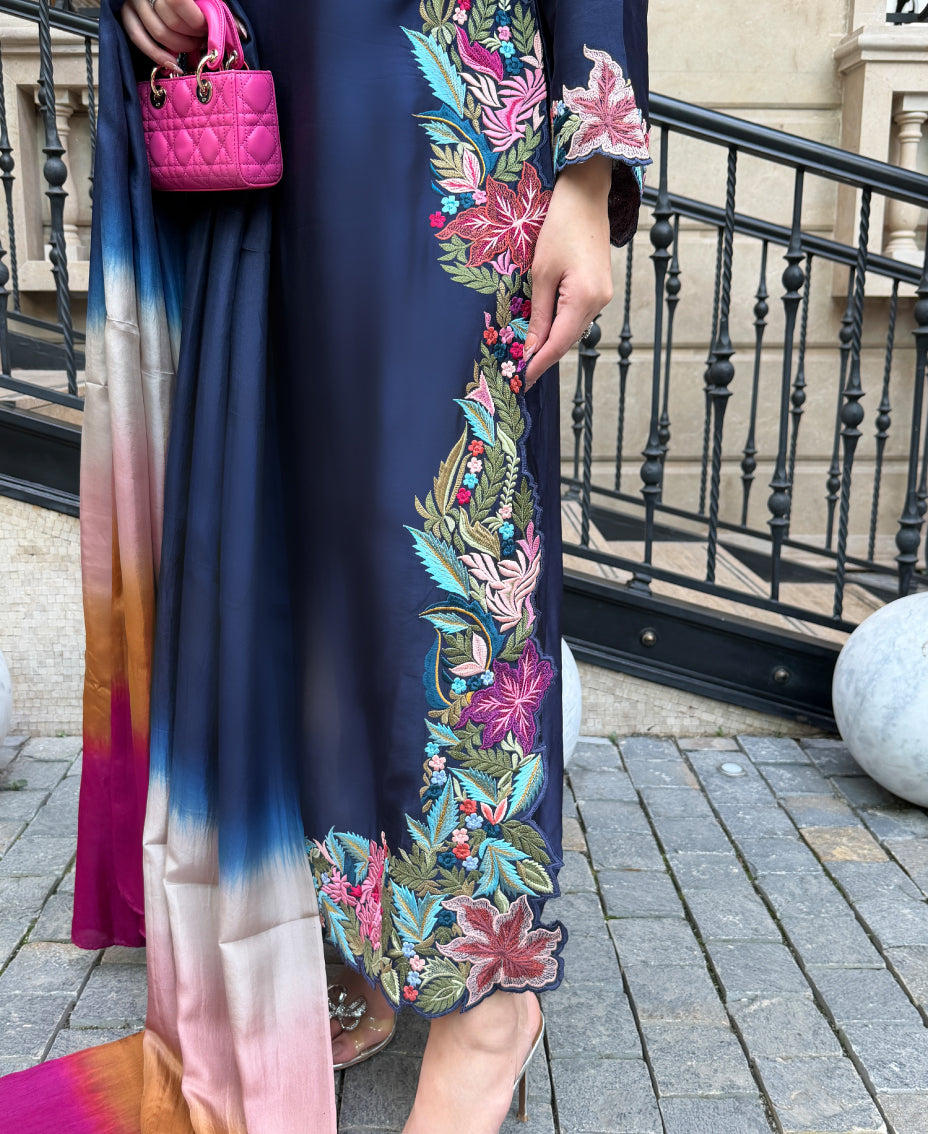This Mystic Garden 3-piece outfit is a graceful sheesha silk long shirt and dupatta set, crafted to bring together elegance, colour harmony, and intricate craftsmanship.