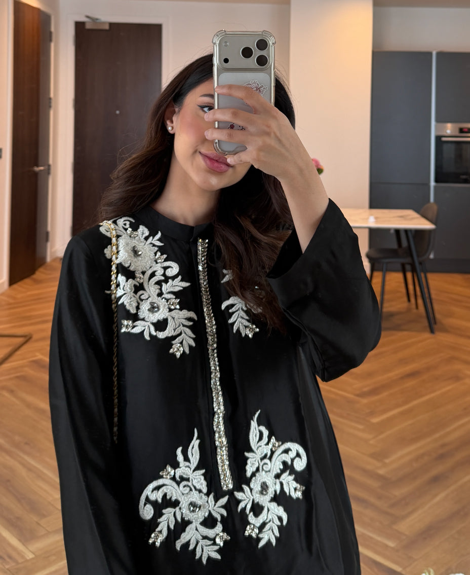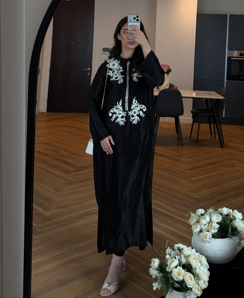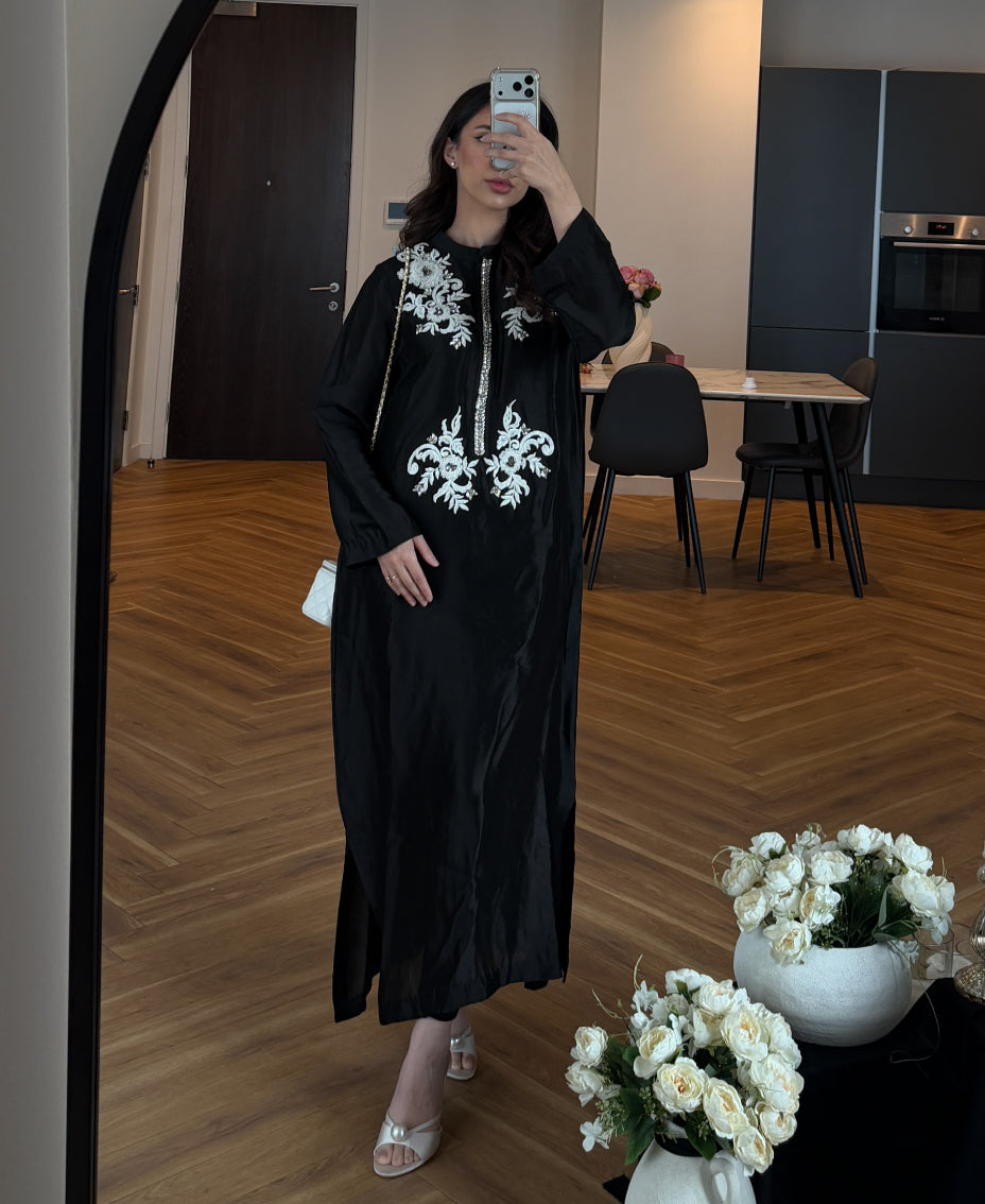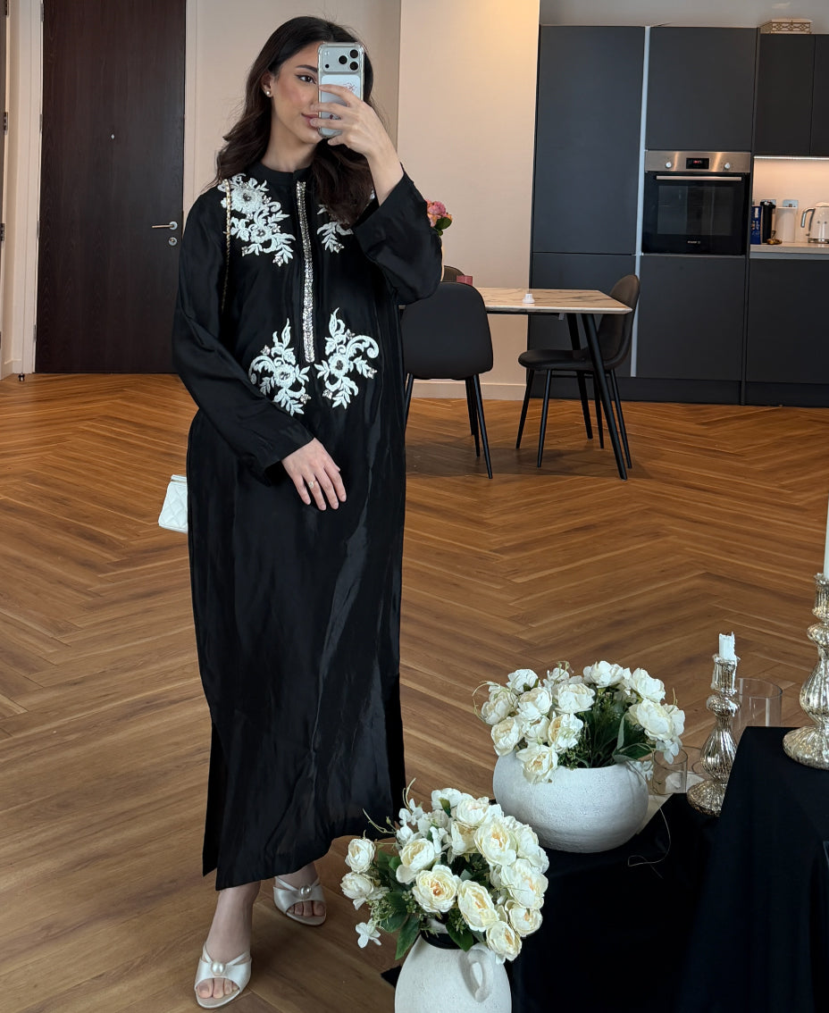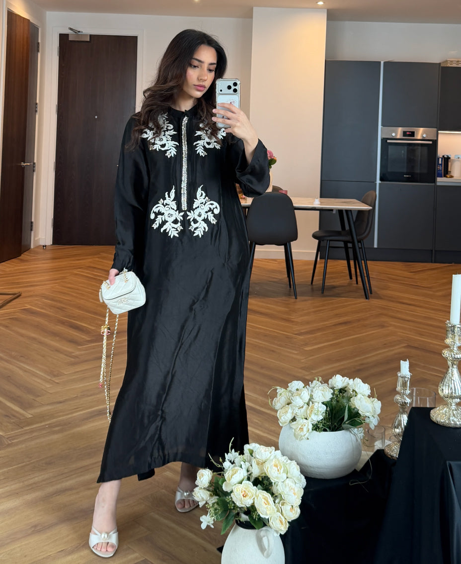 Ideal for formal evenings, festive gatherings, or elegant occasions, this kaftan blends timeless monochrome beauty with modern refinement.