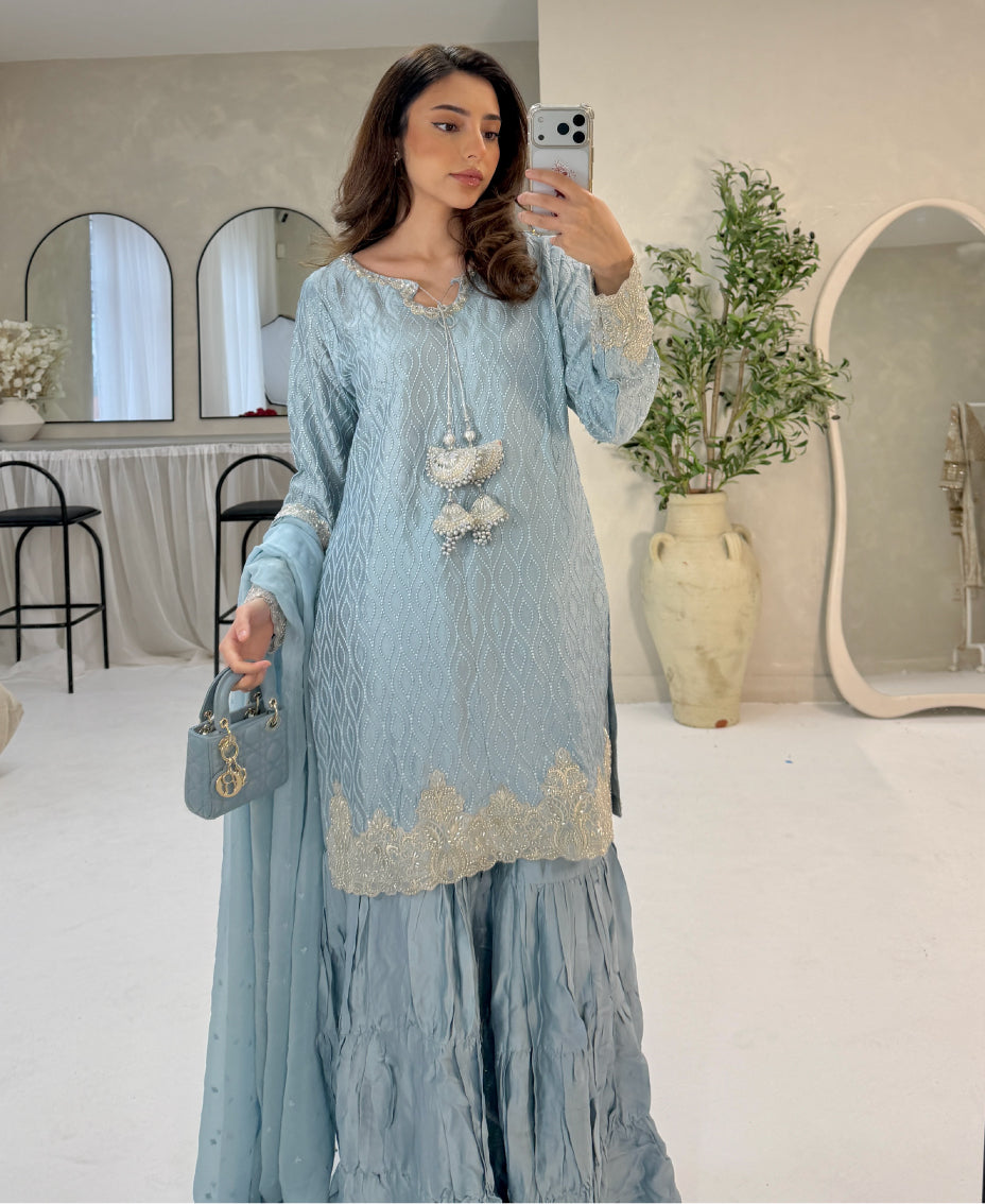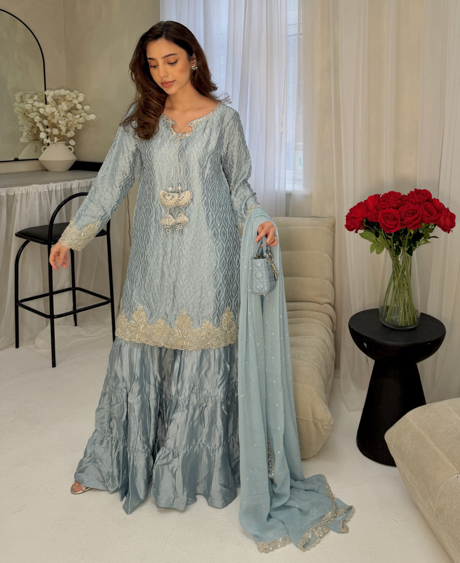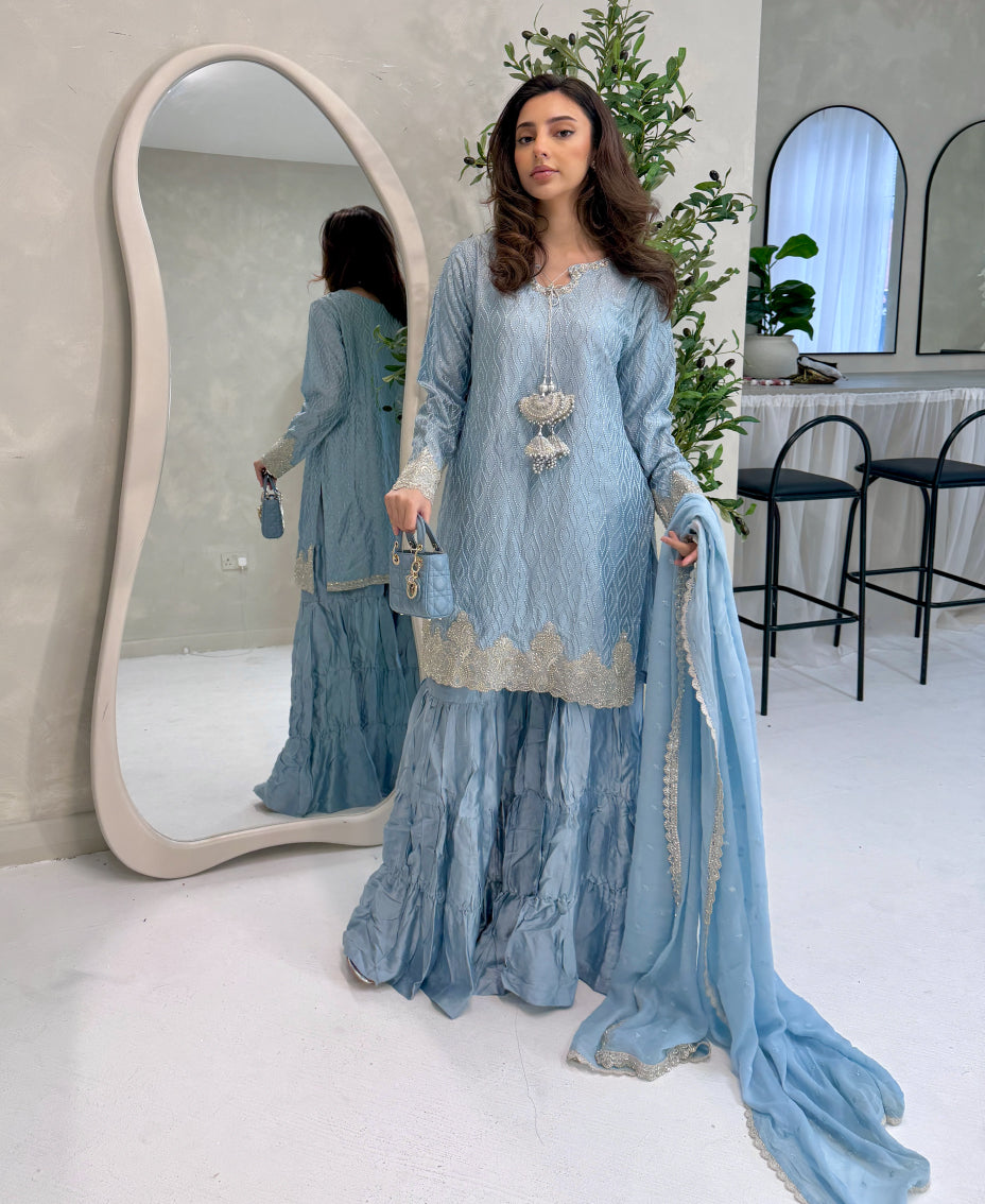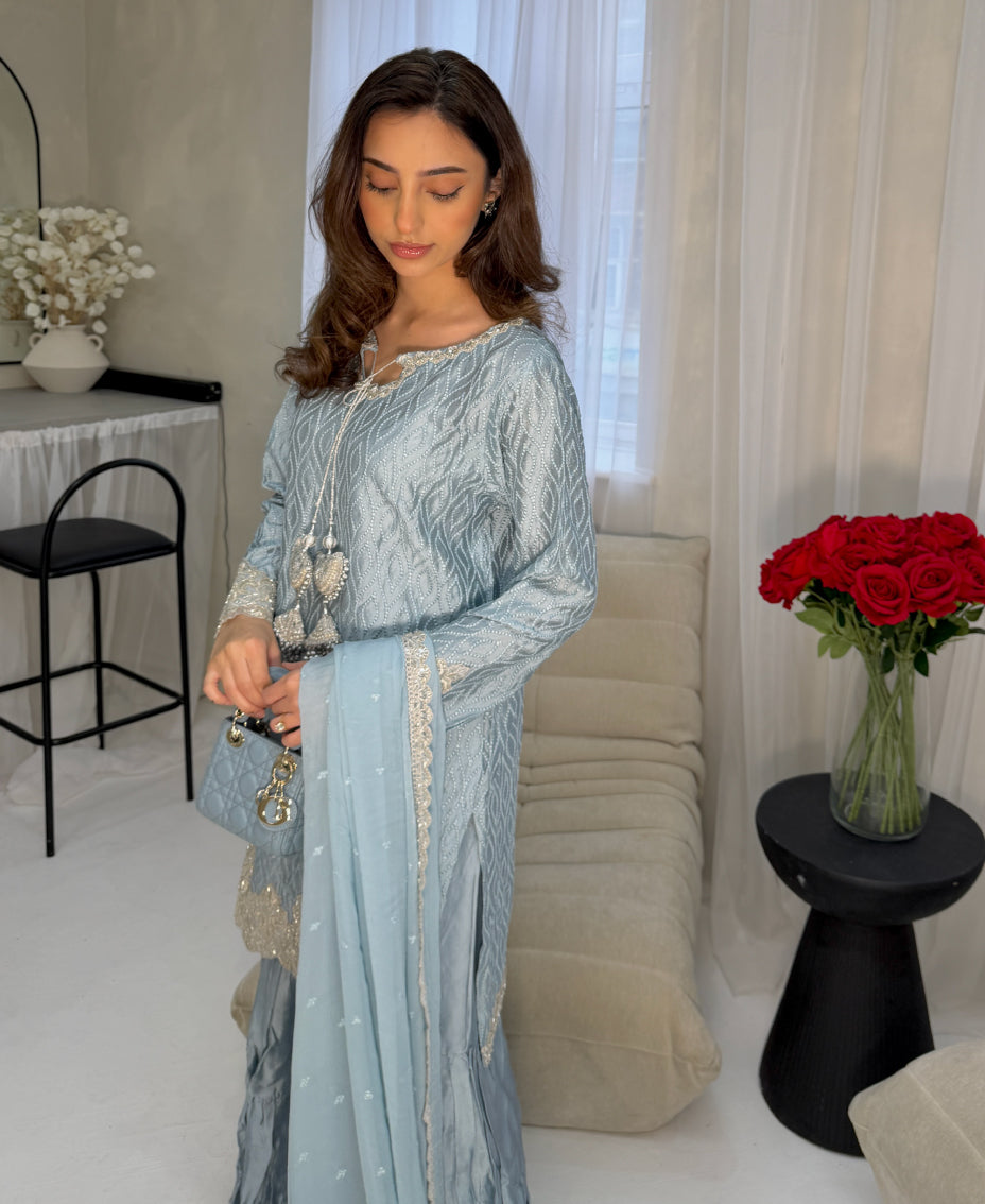 This elegant ice blue gharara set is crafted in luxurious shesha silk, offering a soft sheen and fluid drape that enhances its graceful silhouette. The straight-cut kameez features a minimal neckline with delicate detailing, maintaining a refined and timeless appeal. The hemline is beautifully finished with intricate tonal embroidery, adding subtle texture and sophistication without overpowering the serene color palette.
