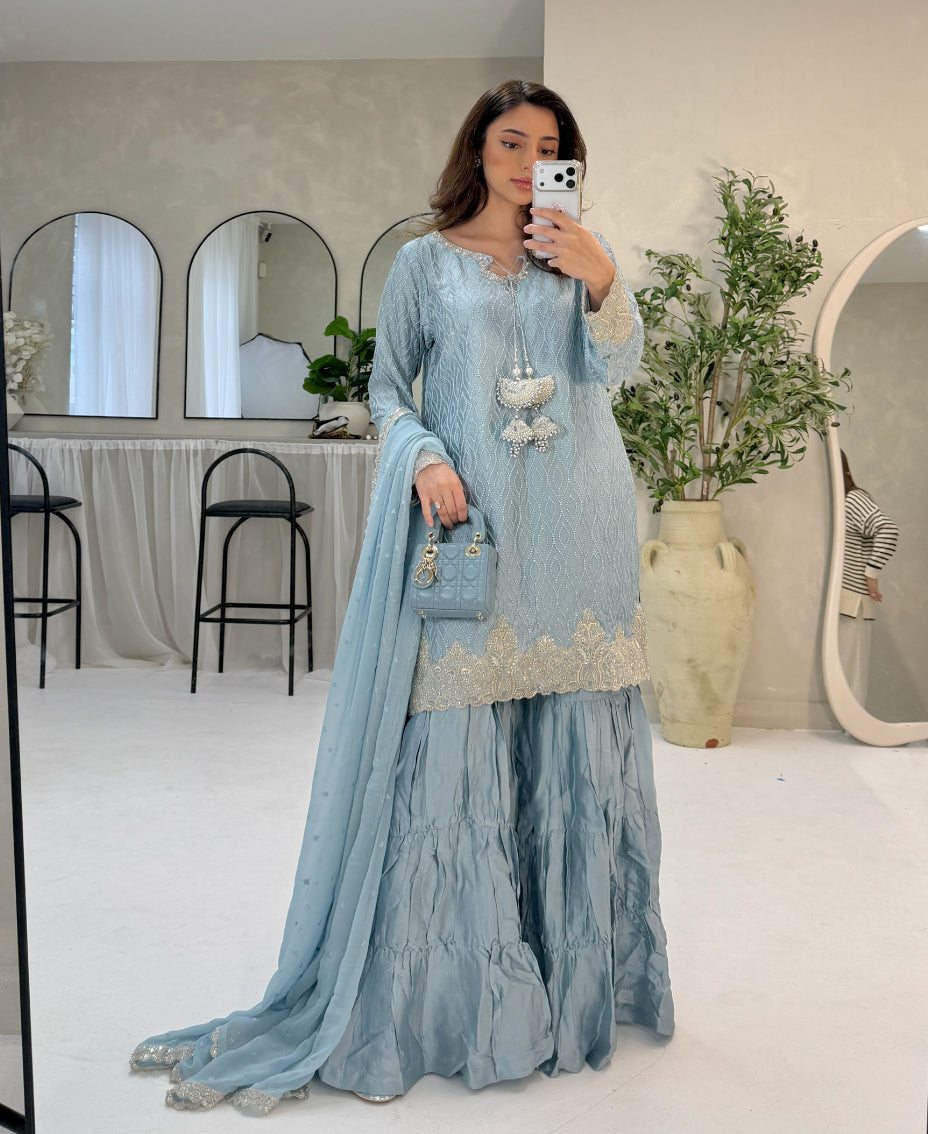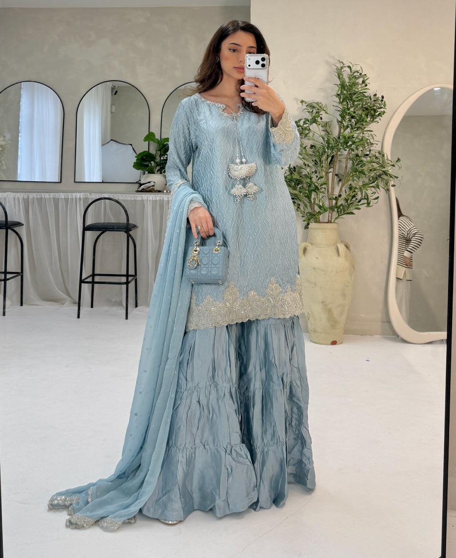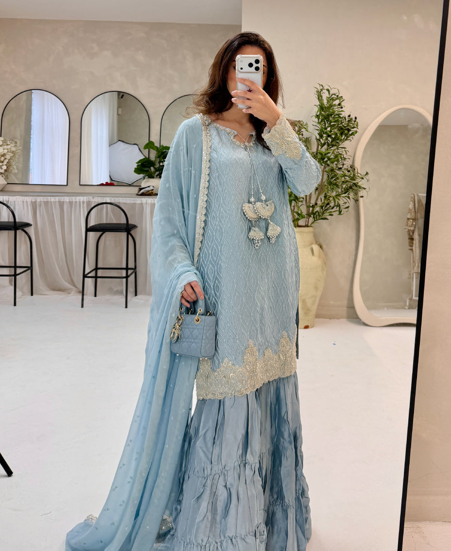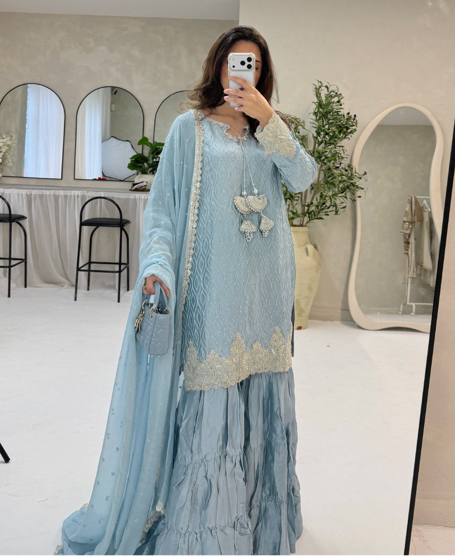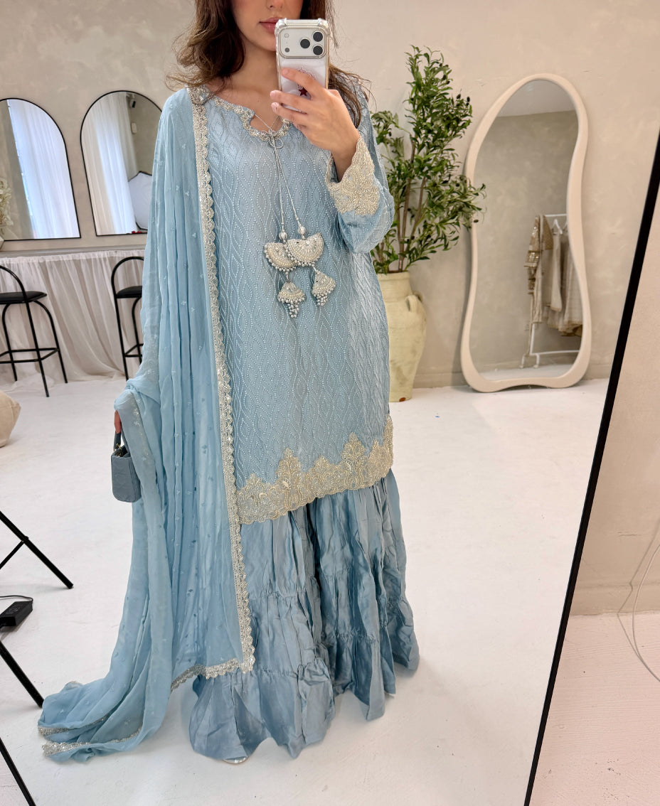 This elegant ice blue gharara set is crafted in luxurious shesha silk, offering a soft sheen and fluid drape that enhances its graceful silhouette. The straight-cut kameez features a minimal neckline with delicate detailing, maintaining a refined and timeless appeal. The hemline is beautifully finished with intricate tonal embroidery, adding subtle texture and sophistication without overpowering the serene color palette.
