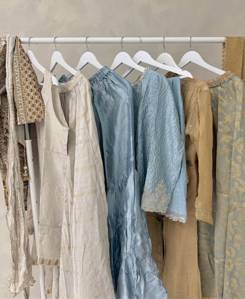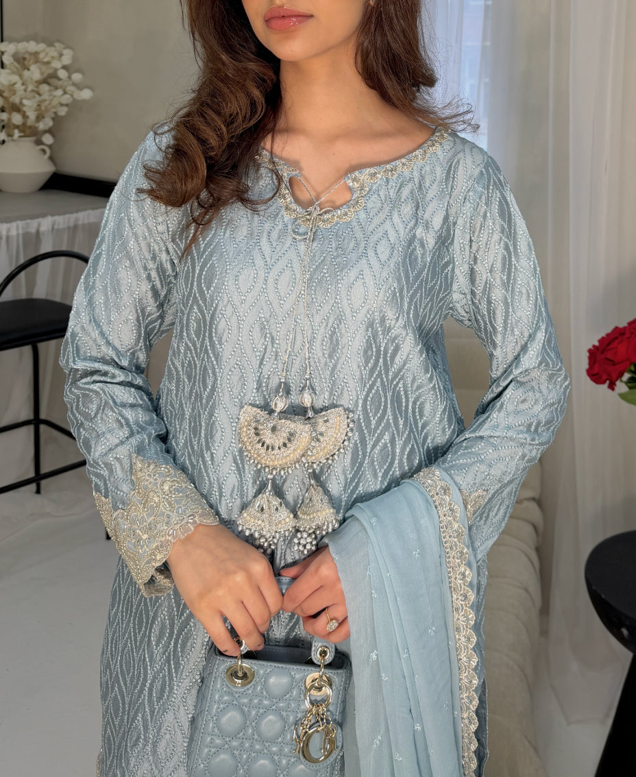 Paired with a matching shesha silk dupatta, softly draped for an ethereal finish, the ensemble exudes understated luxury. The icy blue hue enhances its dreamy aesthetic, making it a perfect choice for festive gatherings, daytime weddings, or elegant soirées.