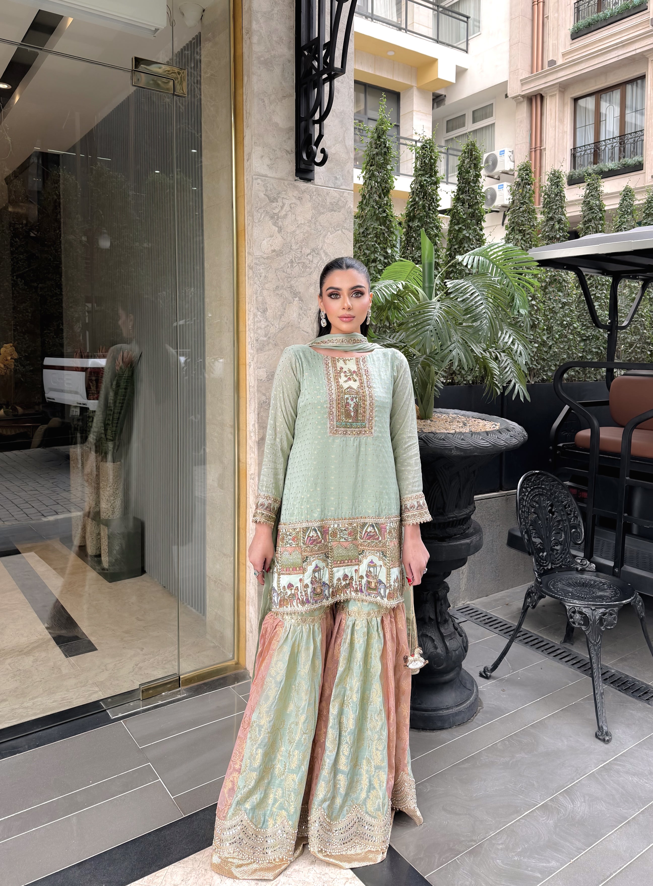 This elegant Noor-e-Sultan mint green gharara set is a timeless ode to heritage craftsmanship and refined femininity. The short kurta is adorned with intricate embroidery and delicate embellishments, featuring a statement Mughal–inspired border that adds depth and storytelling to the design. Crafted in soft, pastel hues with subtle gold accents, the kurta balances tradition with modern grace.