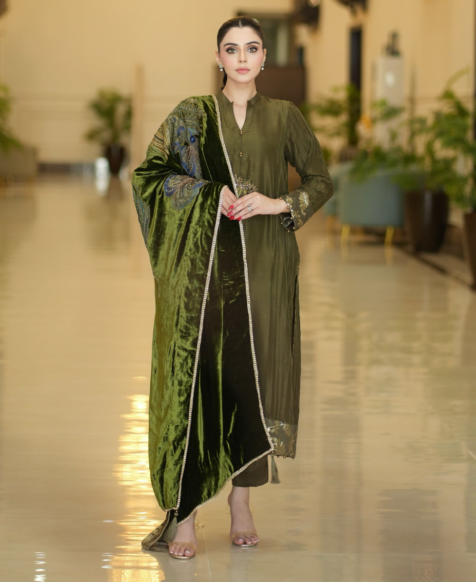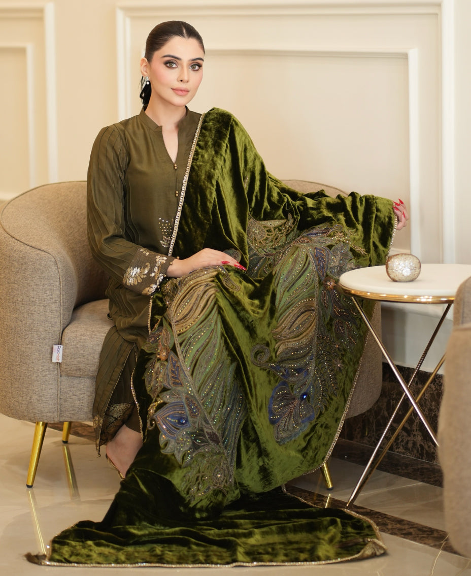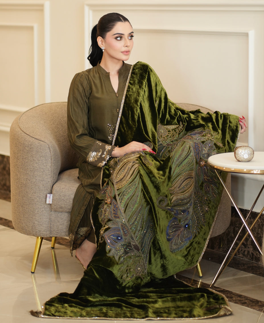 An ode to timeless luxury this olive green ensemble is paired with a velvet shawl, lavishly embellished with intricate peacock feather embroidery. Each detail glistens like jewels, capturing the essence of the peacock’s regal beauty. A statement of elegance, grace, and heritage all wrapped in one.