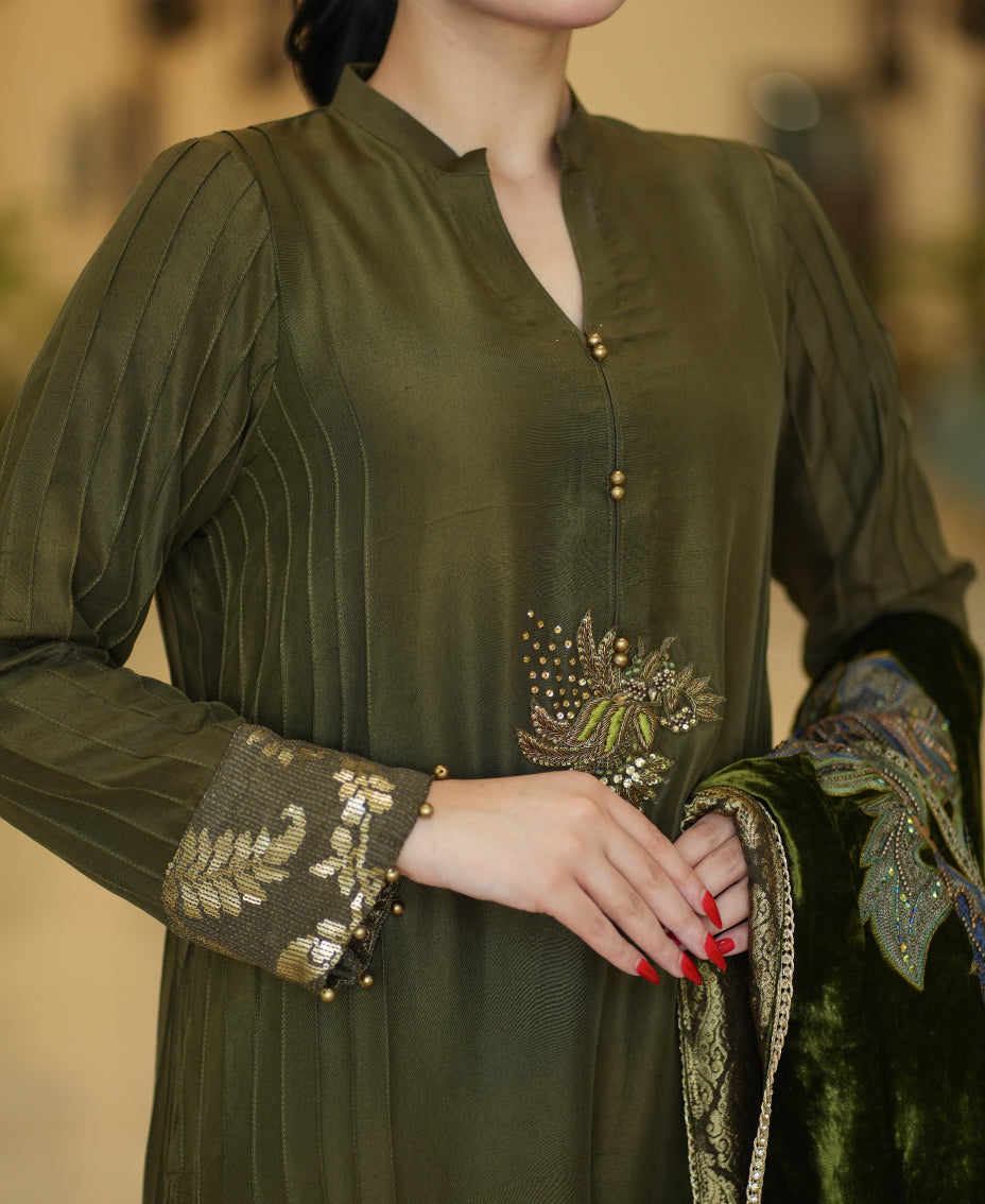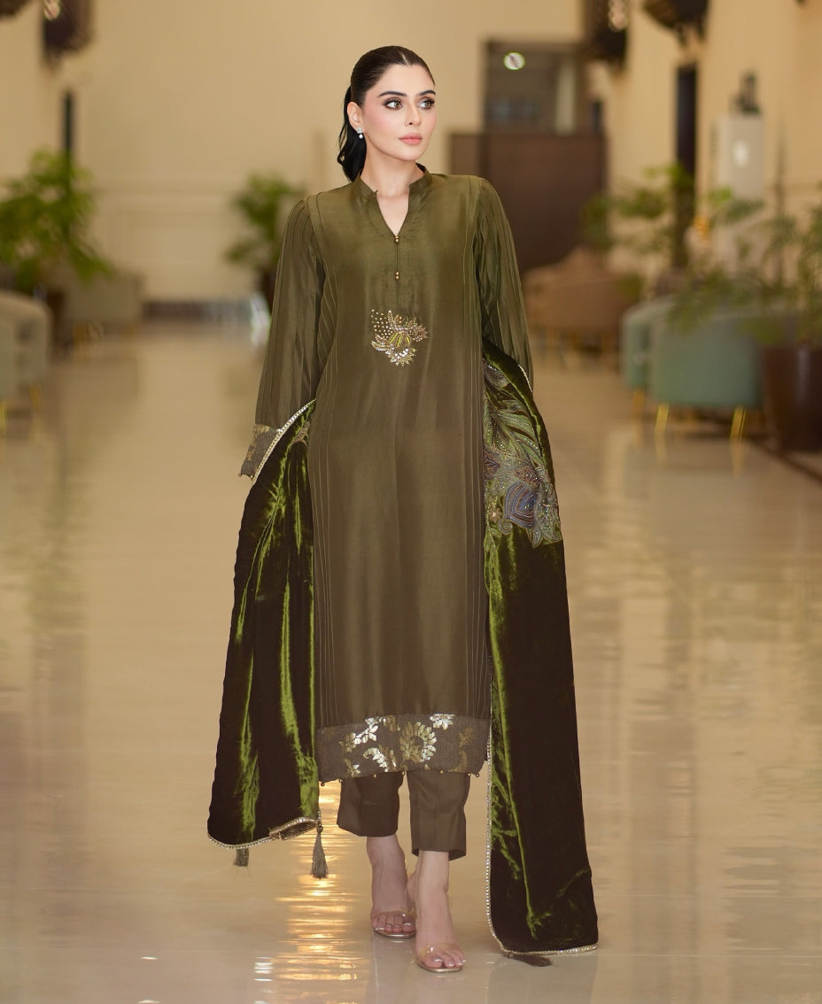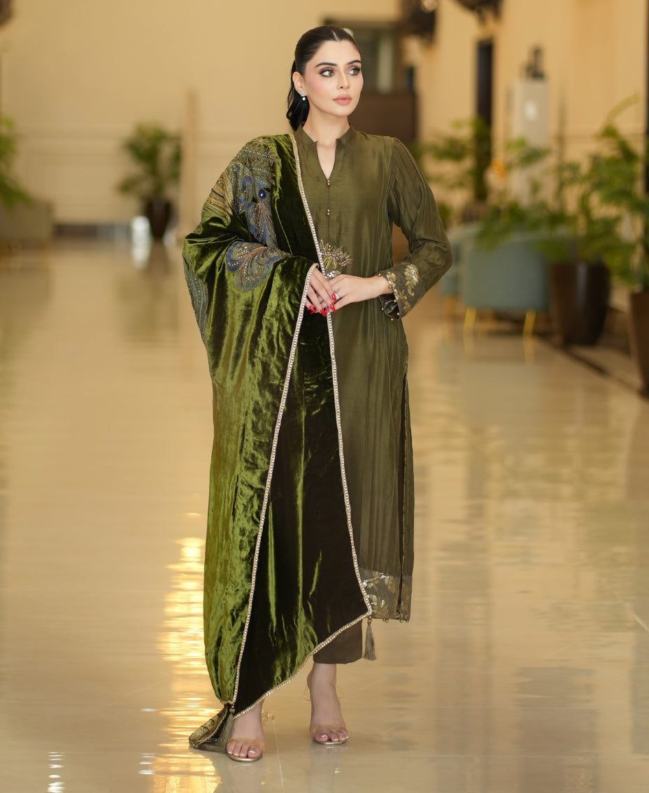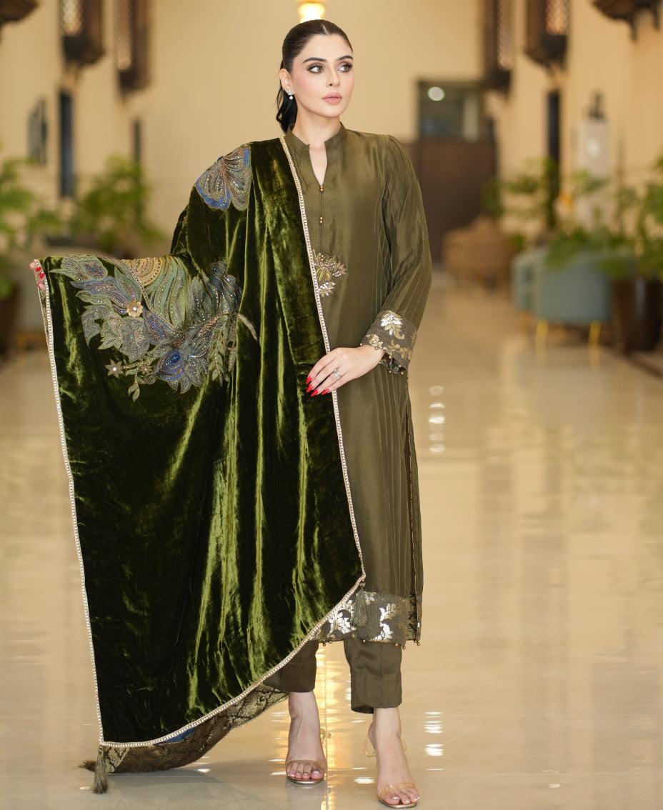 An ode to timeless luxury this olive green ensemble is paired with a velvet shawl, lavishly embellished with intricate peacock feather embroidery. Each detail glistens like jewels, capturing the essence of the peacock’s regal beauty. A statement of elegance, grace, and heritage all wrapped in one.