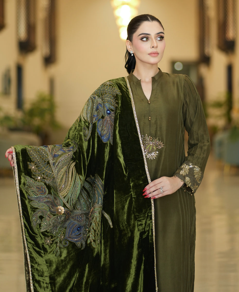 This is a luxurious velvet shawl in a deep olive-green shade, adorned with intricate peacock feather-inspired embroidery. The embroidery is richly detailed with flowing feather motifs in hues of green, gold, and blue, highlighted with shimmering threadwork and delicate bead embellishments that add a touch of sparkle. The design captures the elegance and regality of peacock feathers, making the shawl both opulent and artistic. The border is finished with a contrasting patterned lining and a fine trim, enhancing its overall richness.