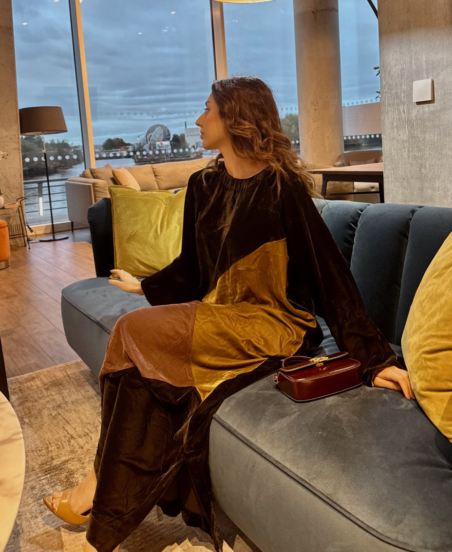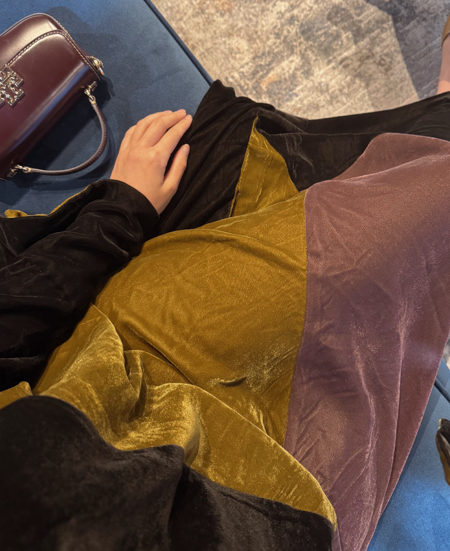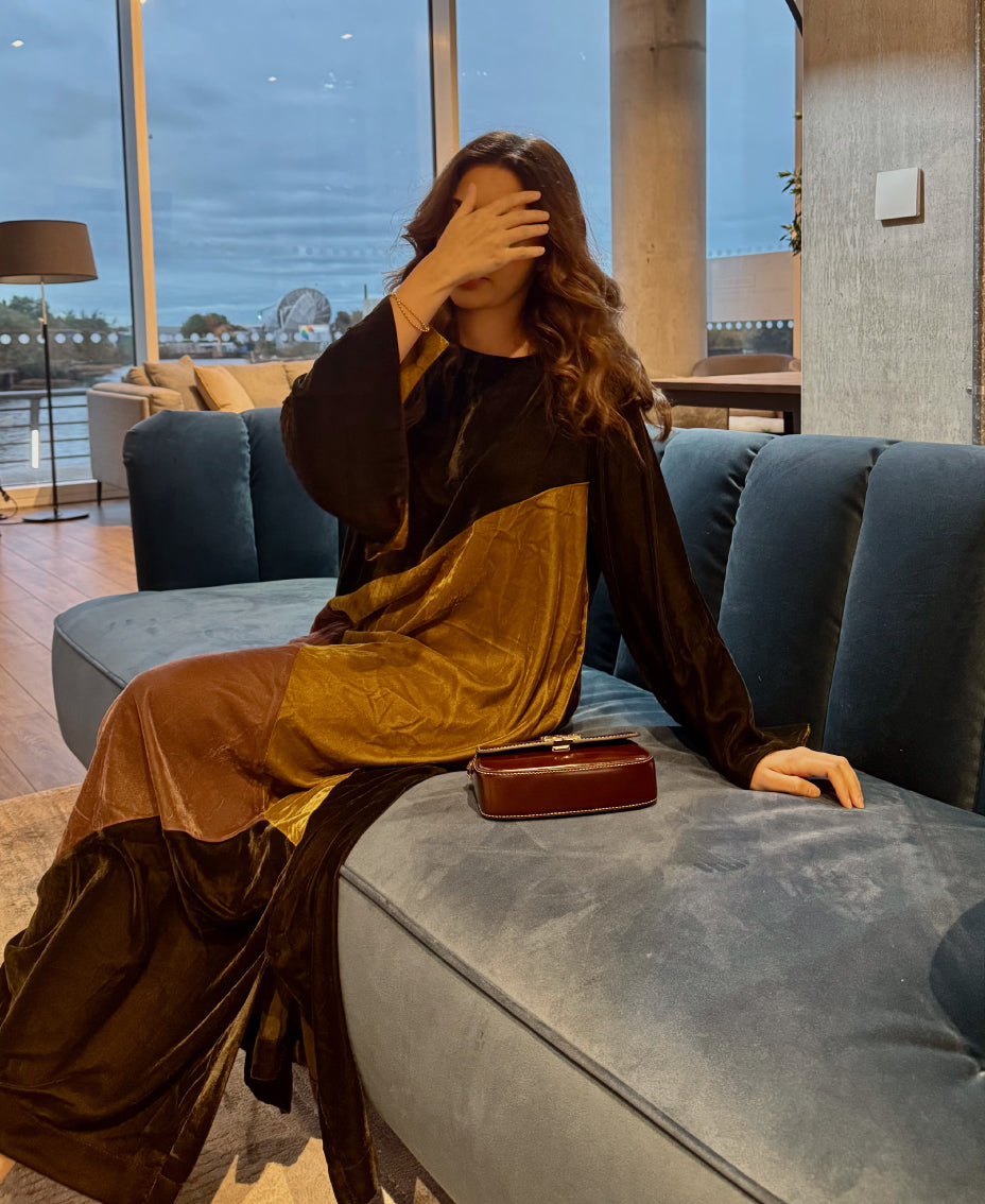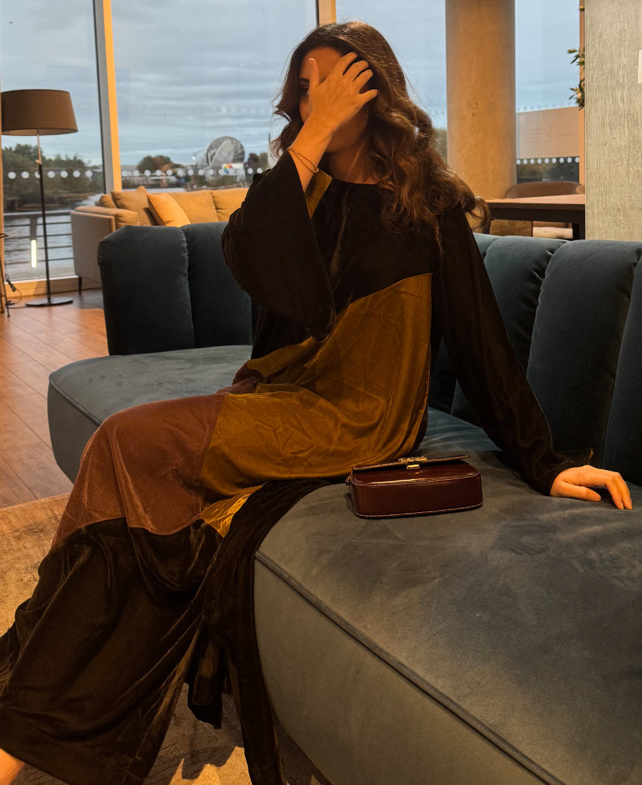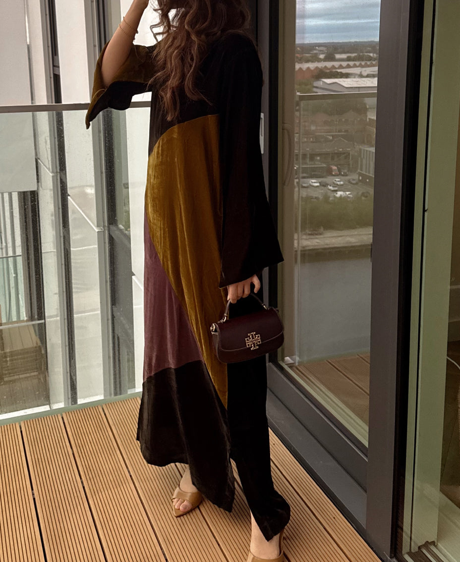This luxurious velvet kaftan Saffron Shadow is a striking piece that effortlessly blends elegance and comfort. Featuring a bold colour-block design with rich shades of velvet , the piece has a relaxed, flowing silhouette that flatters all body types. The soft velvet fabric catches the light beautifully, adding depth and dimension to each hue.