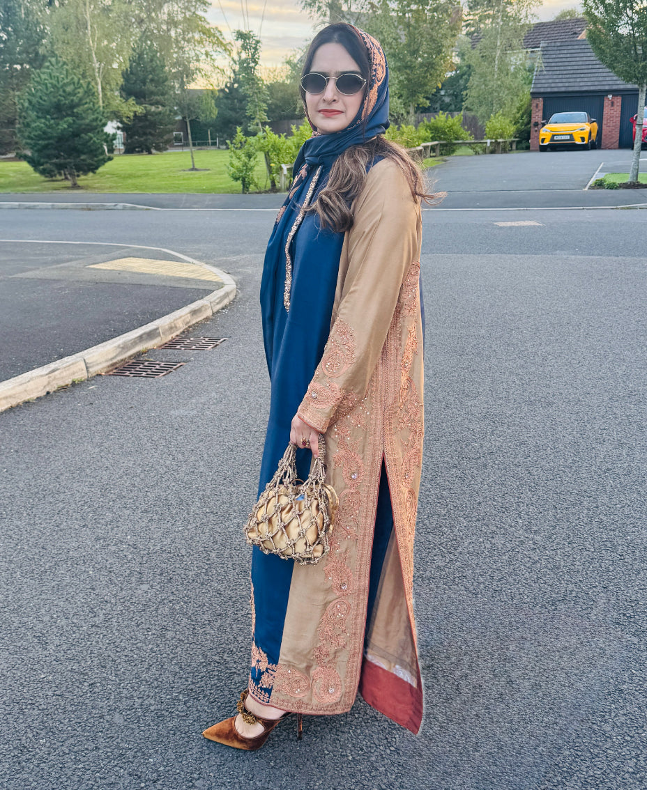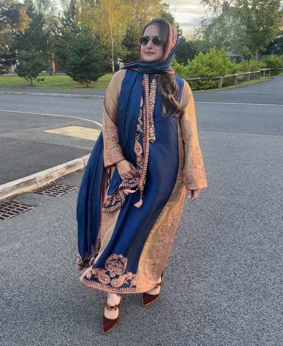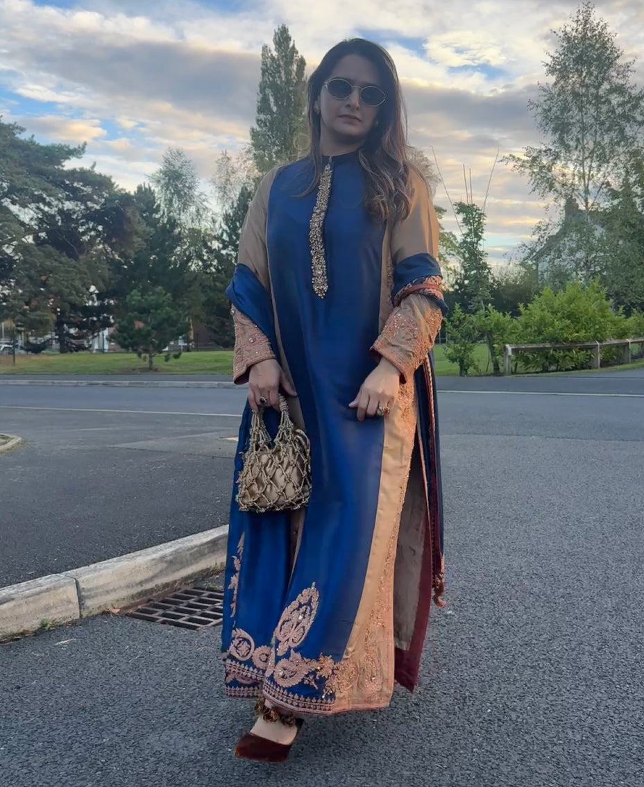 The deep royal blue base is beautifully contrasted with muted gold and peach tones on the borders and sleeves, showcasing fine craftsmanship. The embellishments are delicately placed along the neckline and hem, creating a regal yet graceful aesthetic. Paired with complementing accessories, this outfit strikes the perfect balance between tradition and sophistication, making it ideal for festive occasions, weddings, or formal gatherings.