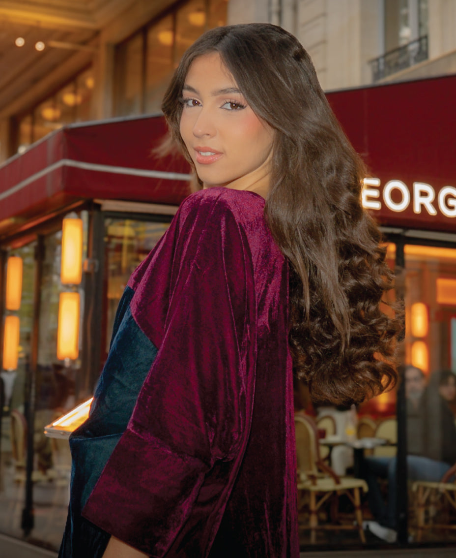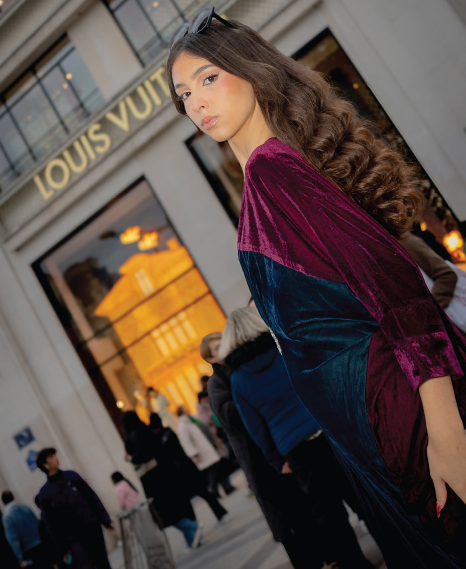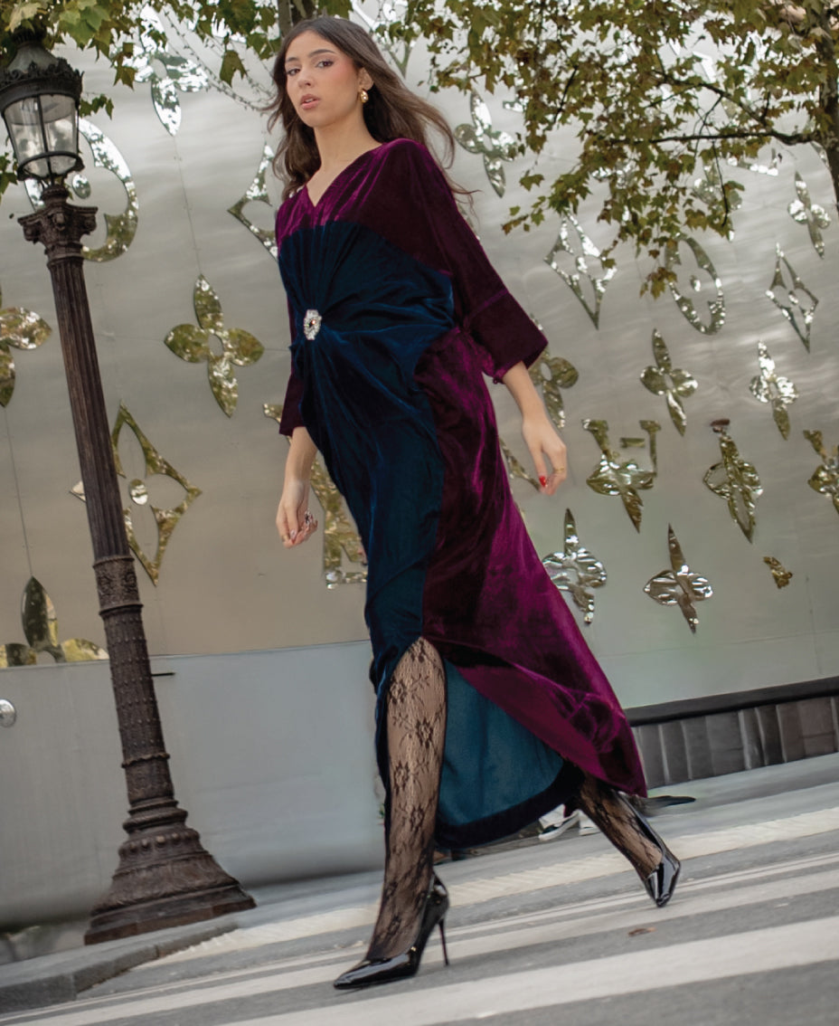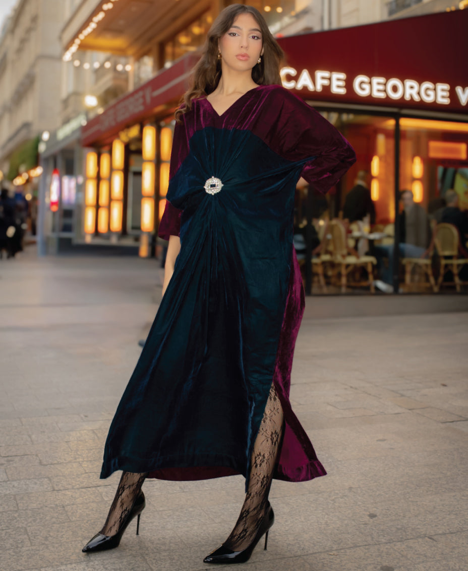 This luxurious two-tone Velvet Orbit kaftan blends deep ruby and midnight black for a striking, high-fashion look. Crafted from rich, soft velvet, it drapes beautifully over the silhouette, offering both sophistication and effortless comfort.